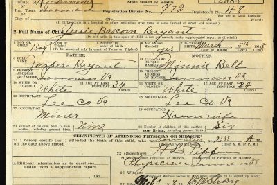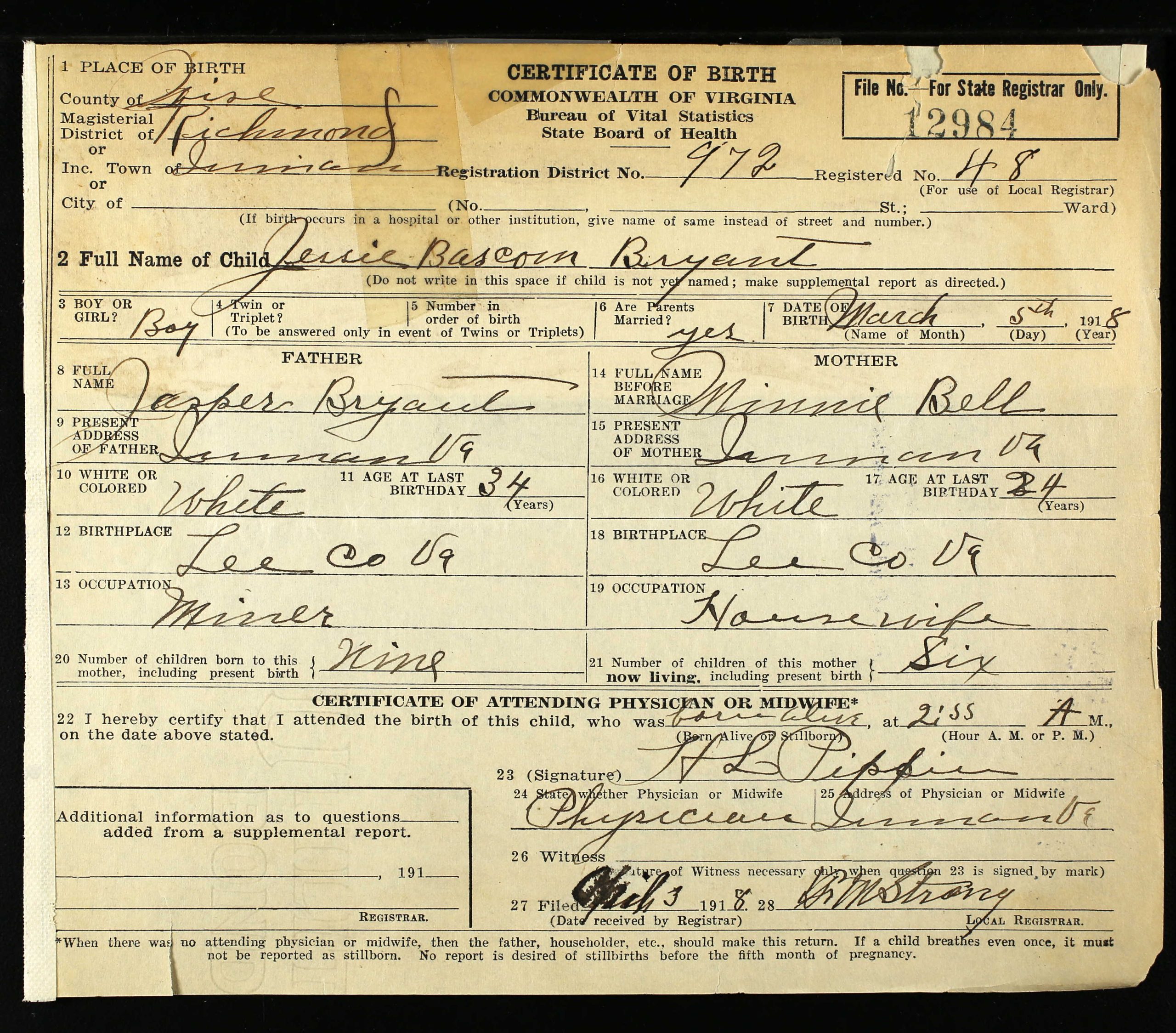 Jessie Bascom Bryant was born at Wise, Virginia, the son of Jasper Bryant and Minnie Bell Skaggs.