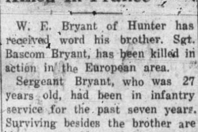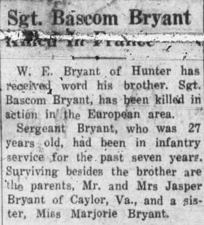 W.E. Bryant of Hunter has received word his brother, Sgt. Bascom Bryant, has been killed in action in the European area. Sergeant Bryant, who was 27 years old, had been in infantry service for the past seven years. Surviving besides the brother are the parents, Mr. and Mrs. Jasper Bryant of Caylor, Va. And a sister, Miss Marjorie Bryant.