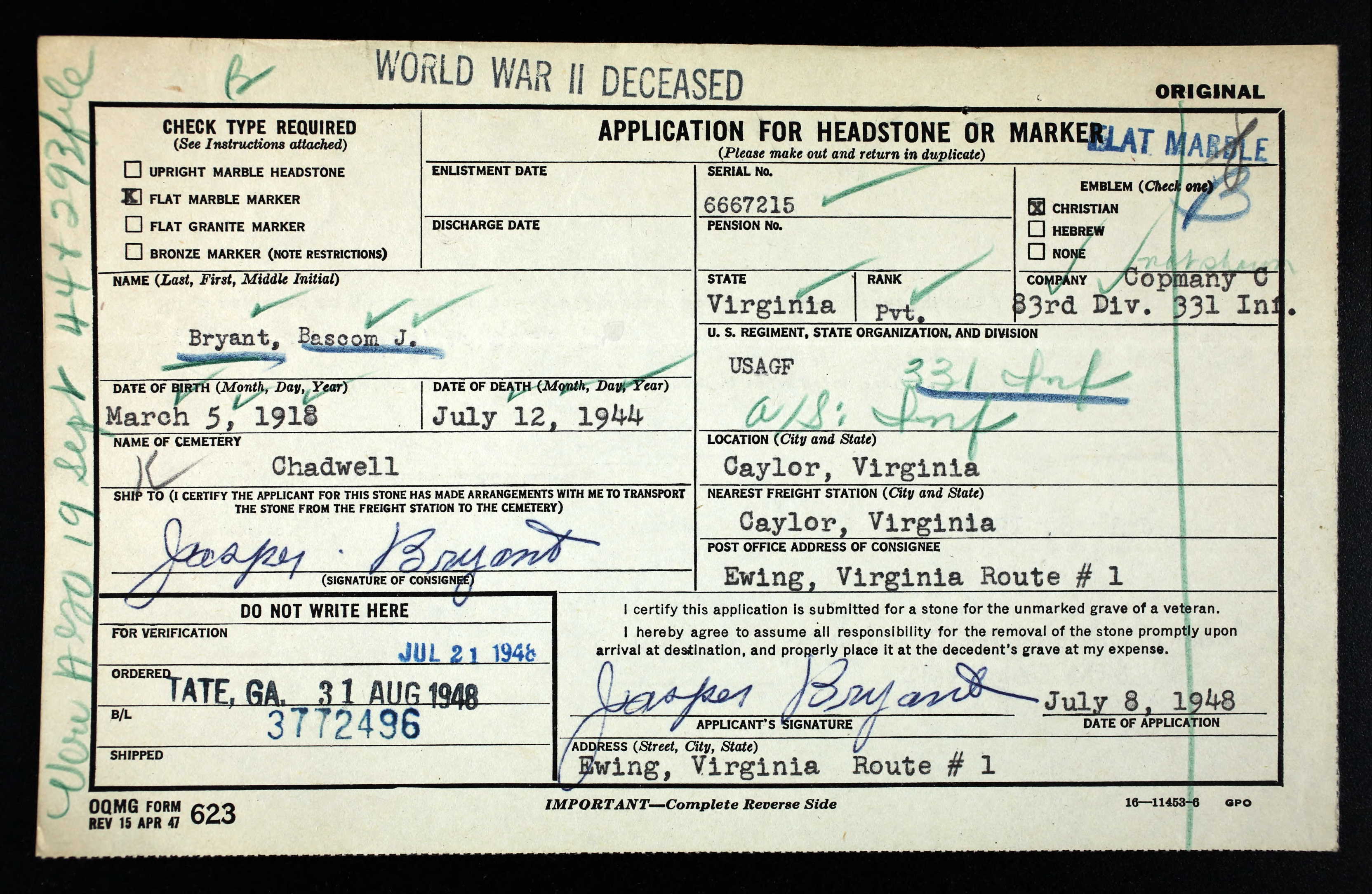 Bascom J. Bryant lived in Lee County, Virginia. He was killed in action July 12, 1944 in Normandy, France, near the town of Carentan.