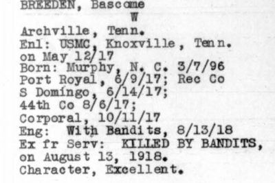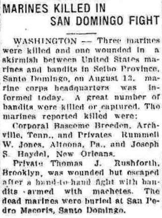 Washington – Three Marines were killed and one wounded in a skirmish between United States Marines and bandits in Seibo Province, Santo Domingo, on August 13, Marine corps headquarters was informed today. A great number of bandits were killed or captured. The Marines reported killed were: Corporal Bascome Breeden, Archville, Tenn., Private Rummell W. Jones, Altoona, Pa., and Joseph S. Haydel, New Orleans. The dead marines were buried at San Pedro Macoris, Santo Domingo.