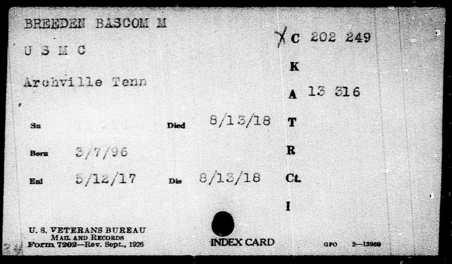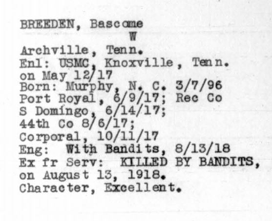 Bascome Breeden was the son of William Bayless Breeden and Ella H. Derreberry. He was killed by bandits at Santo Domingo on 13 August 1918.