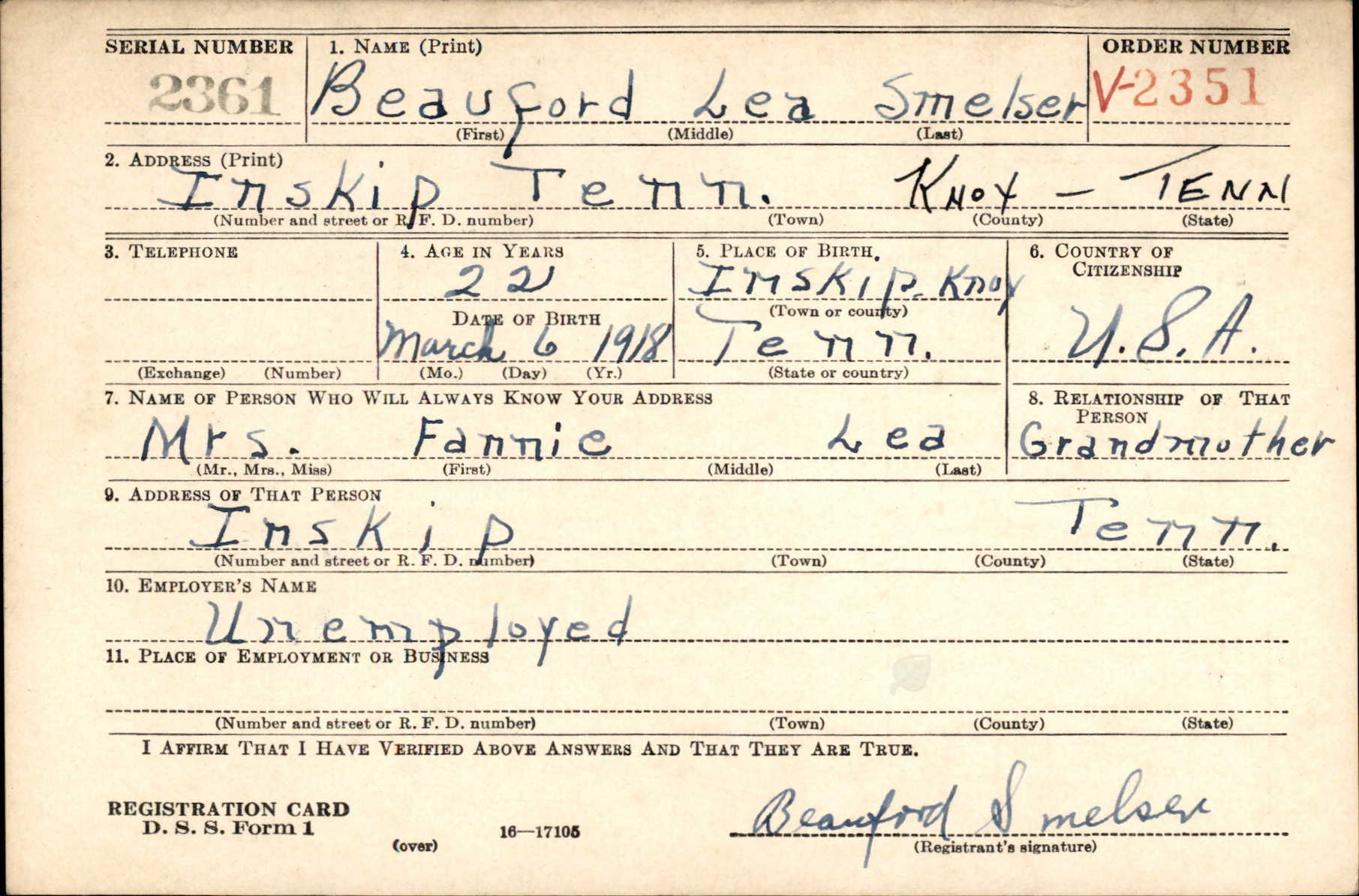 Beauford Lea Smelser was born 6 March 1918, the son of Floyd Smelser and Ora Lea. He was the brother of Roger Ace Smelser. He enlisted on January 10, 1941, in Fort Oglethorpe, GA