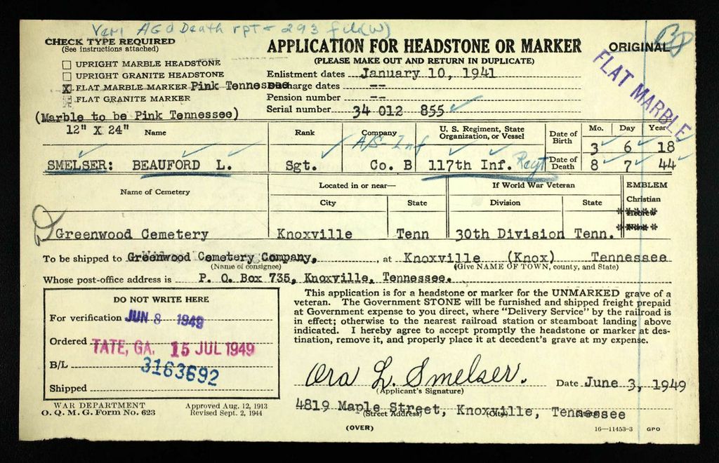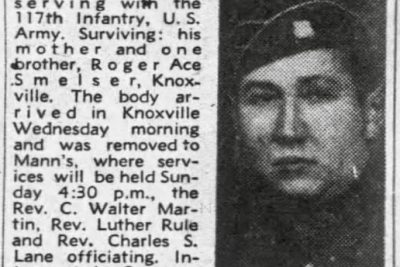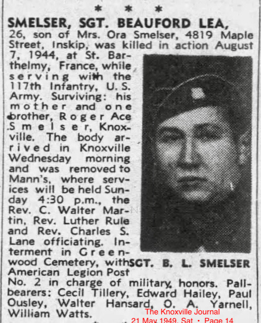 Sgt Beauford Lea Smelser, 26, son of Mrs. Ora Smelser, 4819 Maple Street, Inskip, was killed in action August 7, 1944, at St. Barthelmy, France, while serving with the 117th Infantry, U.S. Army. Surviving: his mother and one brother, Roger Ace Smelser, Knoxville.