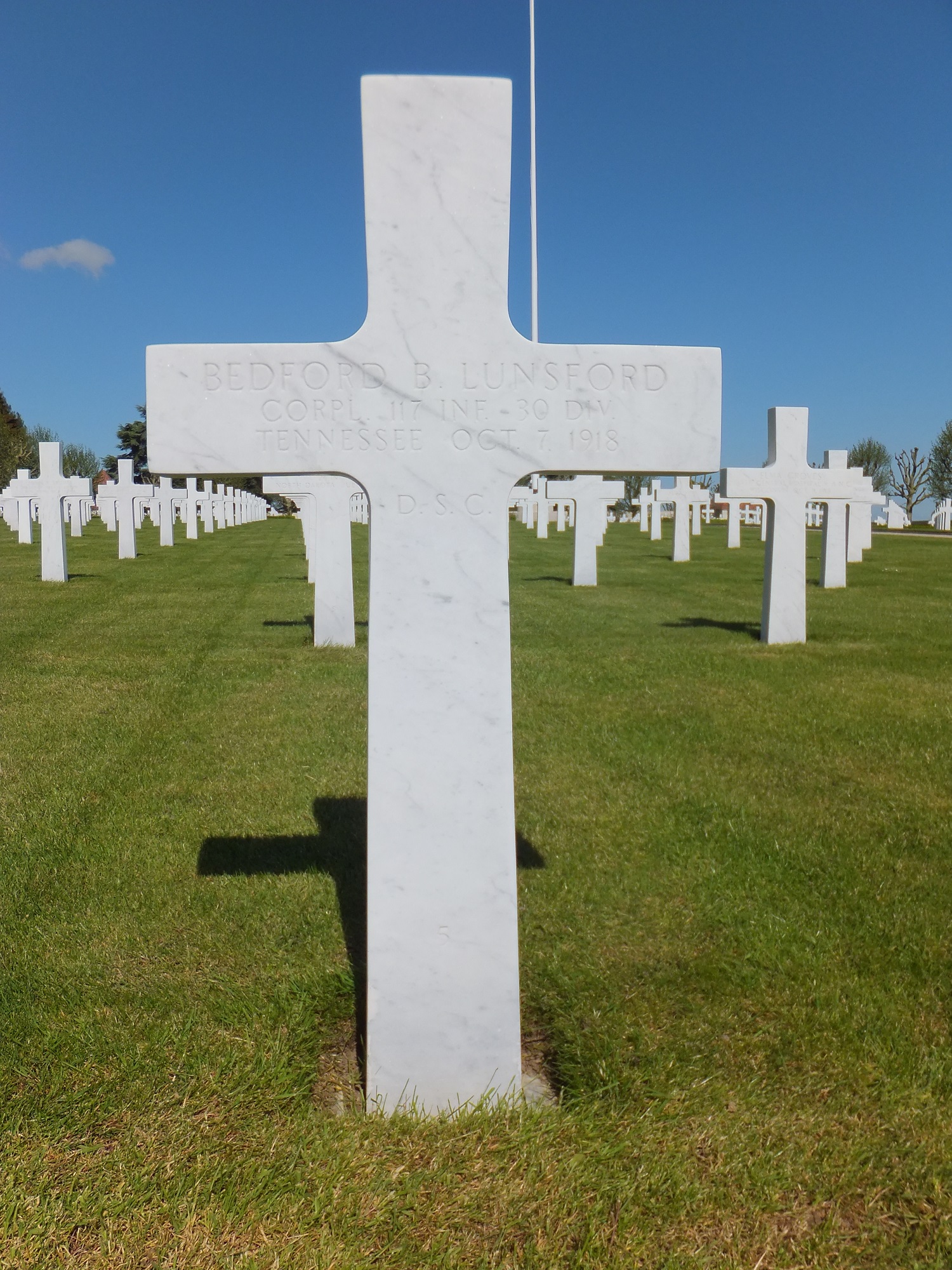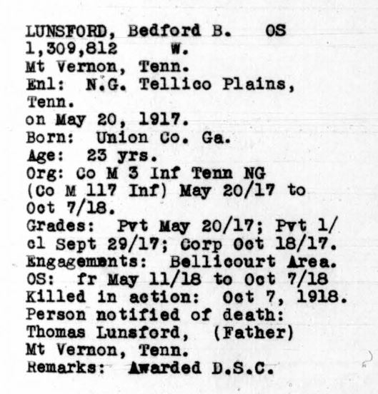 Corporal Bedford B. Lunsford was born in Union County, Georgia. He was assigned to 117th Infantry Regiment, 30th Division AEF. He died on 7 October 1918 at the age of 23, and is interred at A,18,5, Somme American Cemetery, Bony, France.