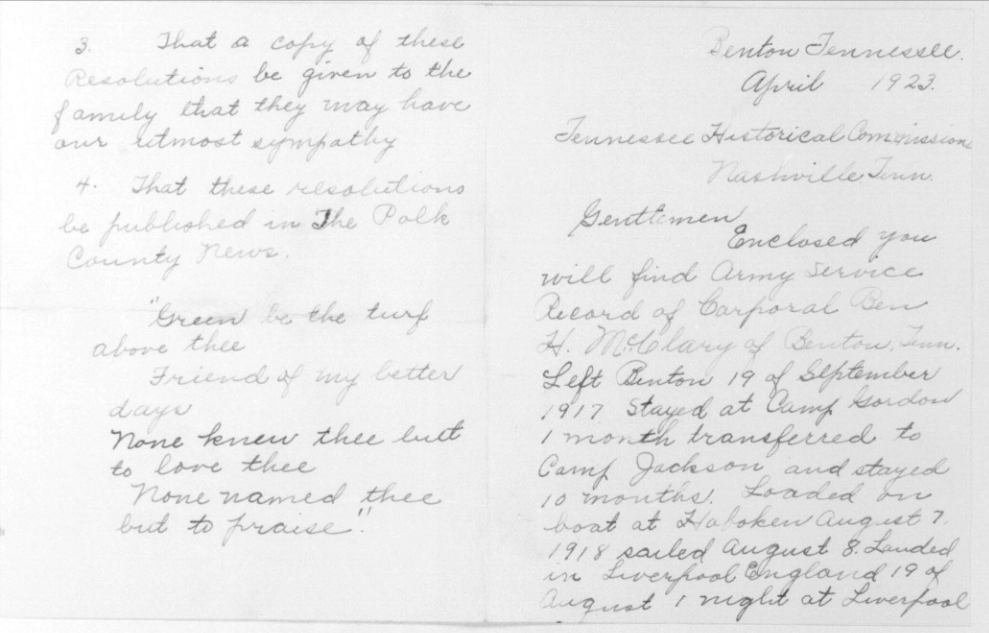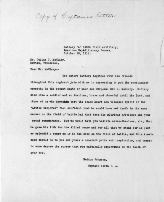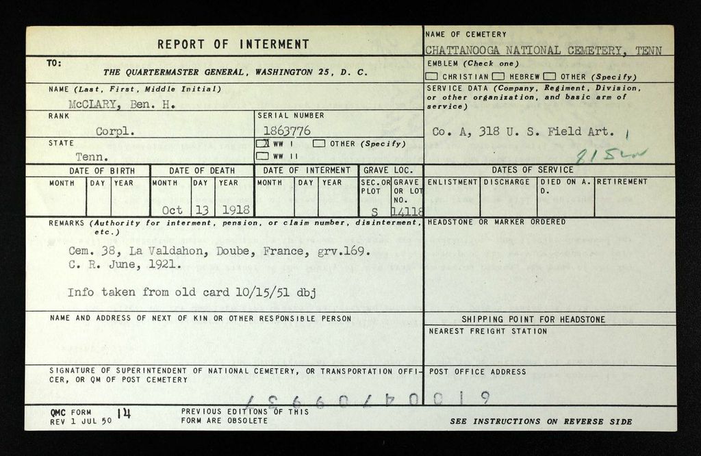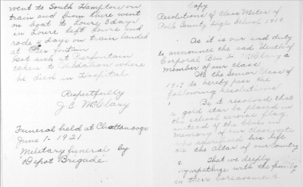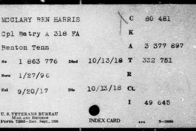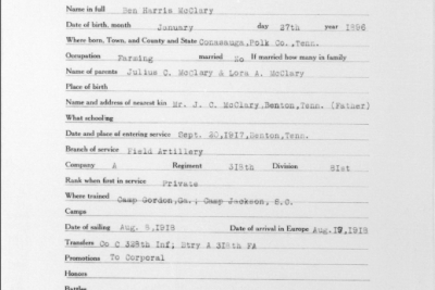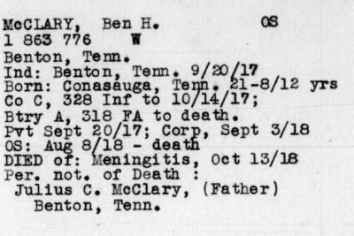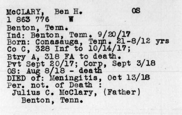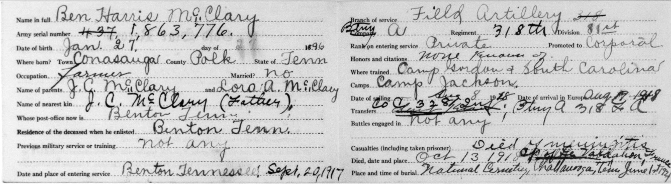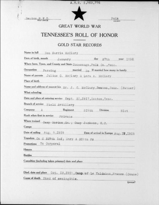 Ben Harris McClary was born 27 January 1896, Conasauga, Polk County, Tennessee to Julius C. and Lora A. McClary. He entered the service September 20, 1917 at Denton, Tennessee and trained at Camp Gordon in Georgia and Camp Jackson in South Carolina. He sailed to Europe August 8, 1918, arriving August 19. He served with the 318th U.S. Field Artillery, 81st Division, Battery A.