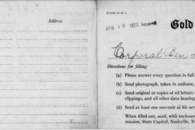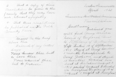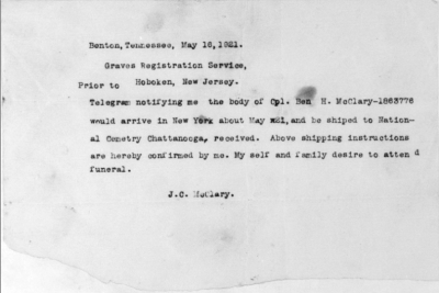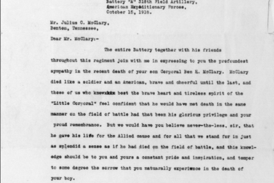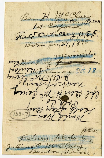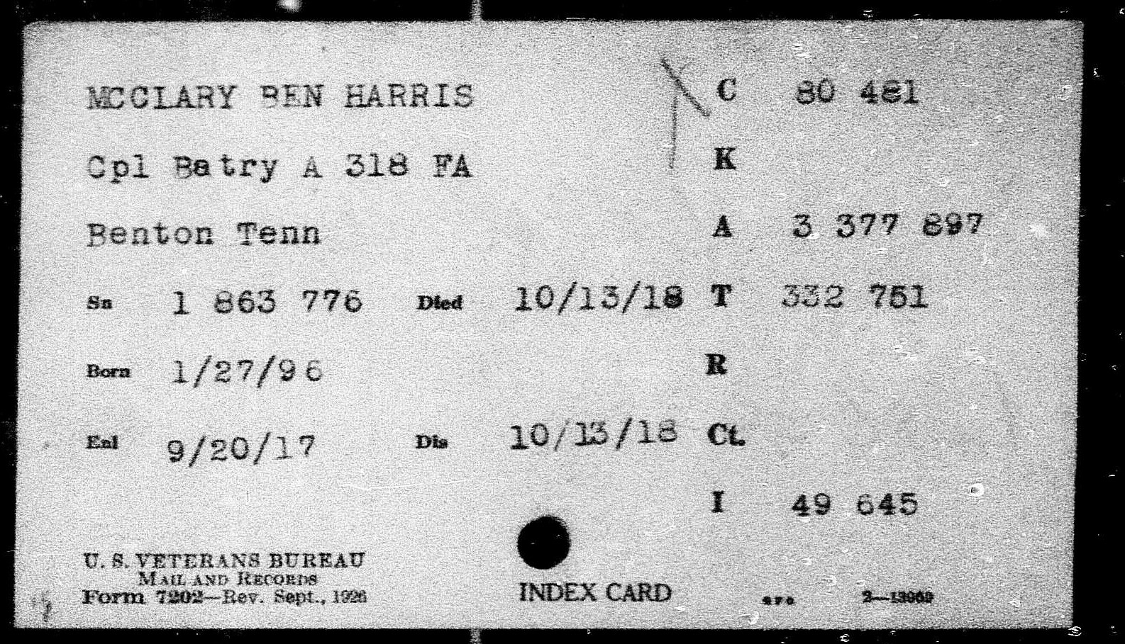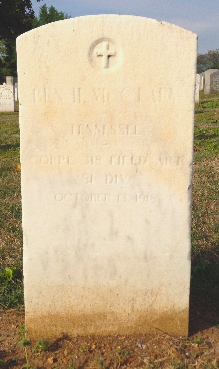 Ben Harris McClary was born 27 January 1896, Conasauga, Polk County, Tennessee to Julius C. and Lora A. McClary. He entered the service September 20, 1917 at Denton, Tennessee and trained at Camp Gordon in Georgia and Camp Jackson in South Carolina. He sailed to Europe August 8, 1918, arriving August 19. He served with the 318th U.S. Field Artillery, 81st Division, Battery A.