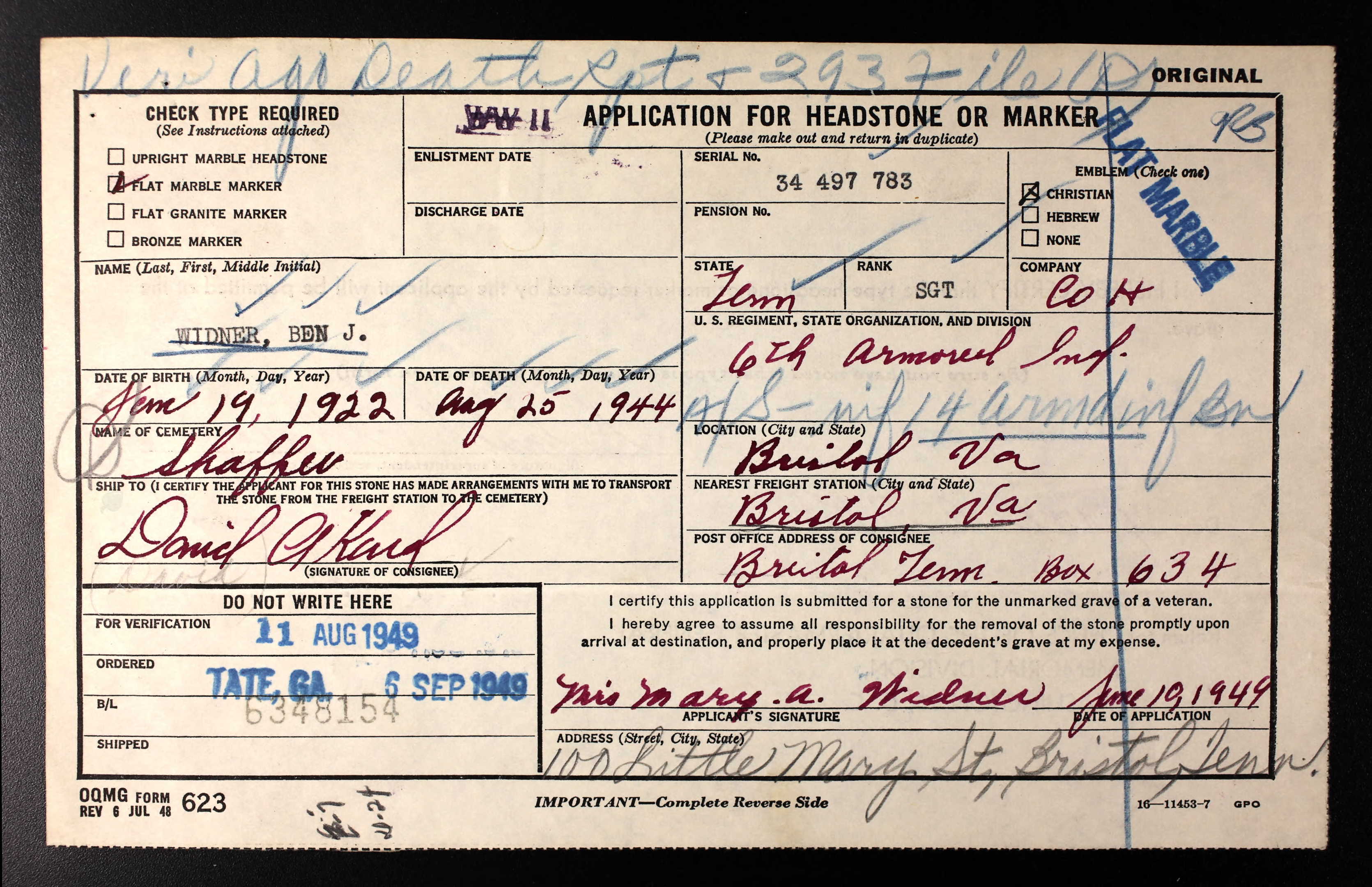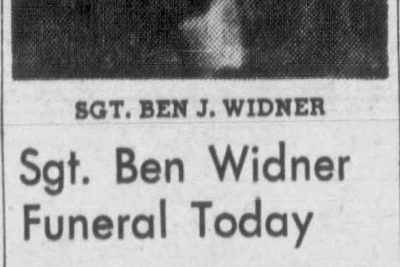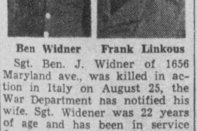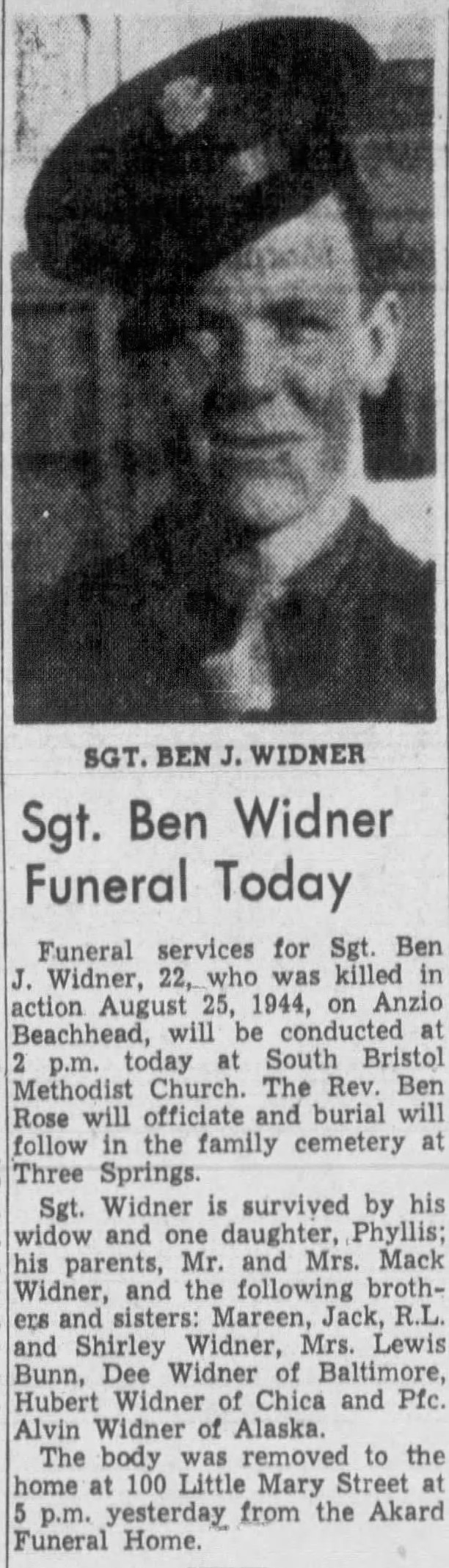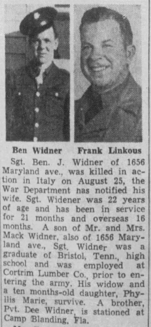 Sgt. Ben J. Widner of 1656 Maryland Ave., was killed in action in Italy on August 25, the War Department has notified his wife. Sgt. Widener was 22 years of age and has been in service for 21 months and overseas 16 months. A son of Mr. and Mrs. Mack Widner, also of 1656 Maryland Ave., Sgt Widner was a graduate of Bristol, Tenn., high school and was employed at Cortrim Lumber Co., prior to entering the army. His widow and a ten months-old aughter, Phyllis Marie, survive. A brother, Pvt. Dee Widner, is stationed at Camp Blanding, Fla.