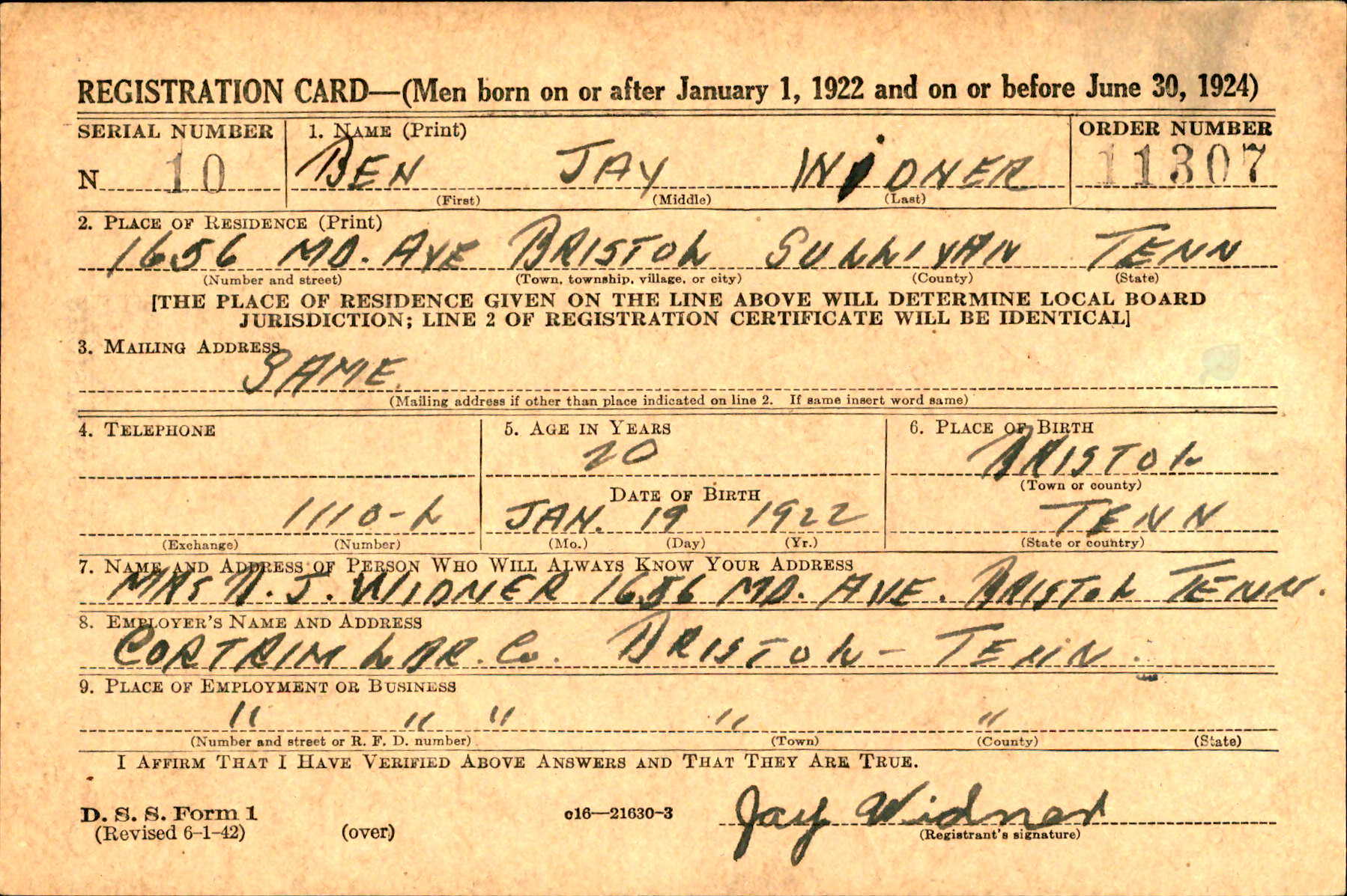 Ben Jay Widner was born on 19 January 1922 in Bristol, Tennessee. he was the son of Frederick Mack Widner and Lottie Oliver.