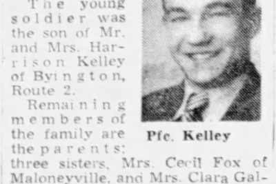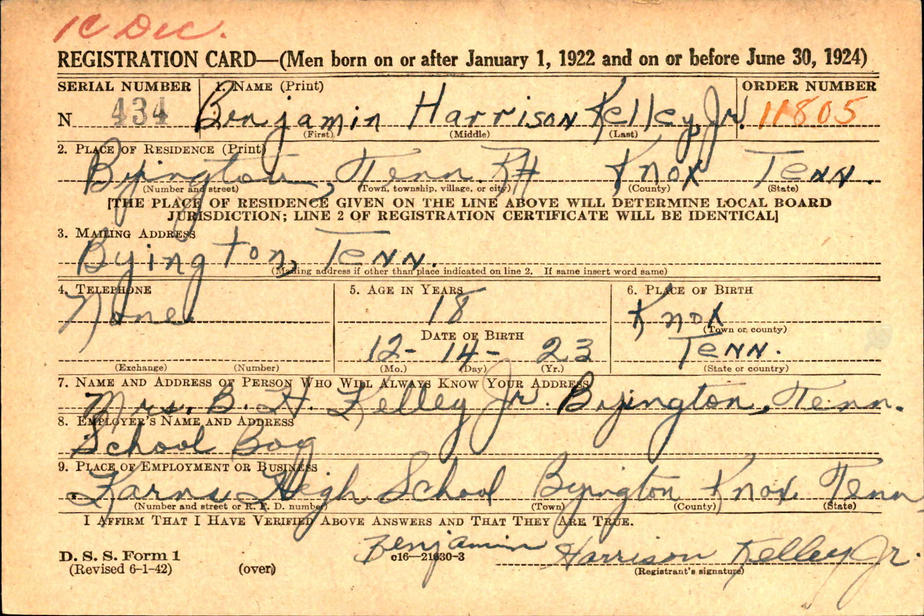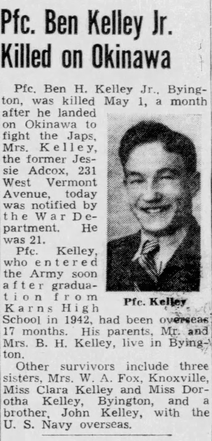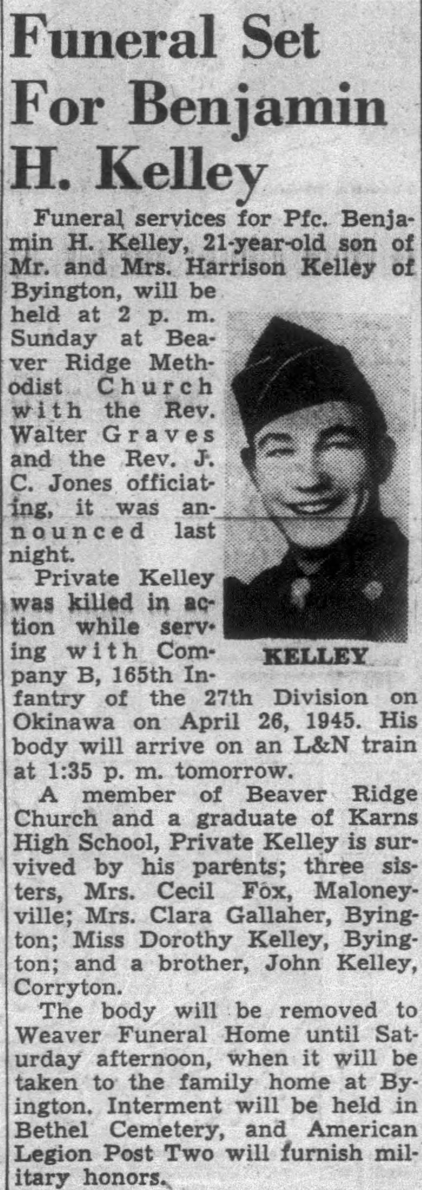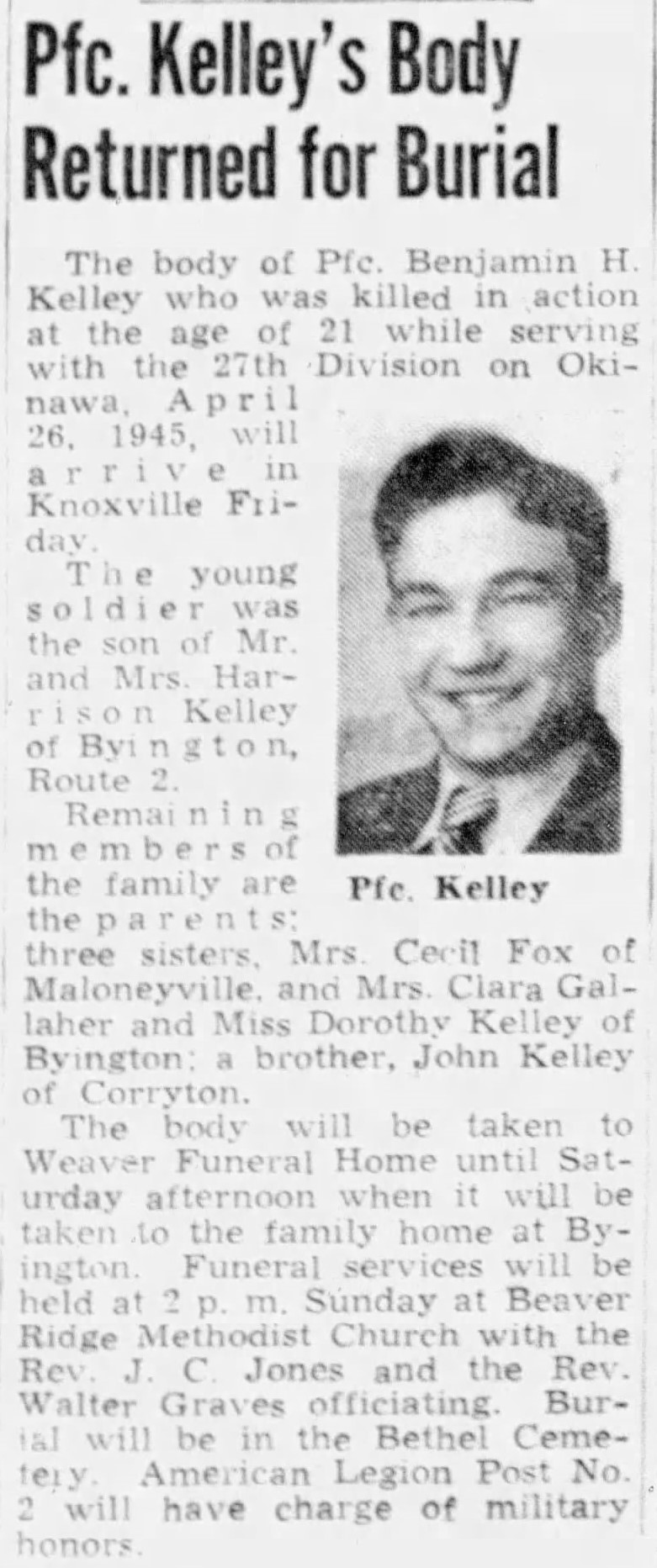 Funeral services for Pfc. Benjamin H. Kelley, 21-yar-old son of Mr. and Mrs. Harrison Kelley of Byington, will ben held at Beaver Ridge Methodist Church.Private Kelleyn was killed in action while serving with Company B, 165th Infantry of the 27th Division on Okinawa on April 26, 1945. His body will arrive on an L&N train. A member of Beaver Ridge Church and a graduate of Karns High School, Private Kelley is survived by his parents; three sisters, Mrs. Cecil Fox, Maloneyville; Mrs. Clara Gallaher, Byington; Miss Dorothy Kelley, Byington; and a brother, John Kelley, Corryton.