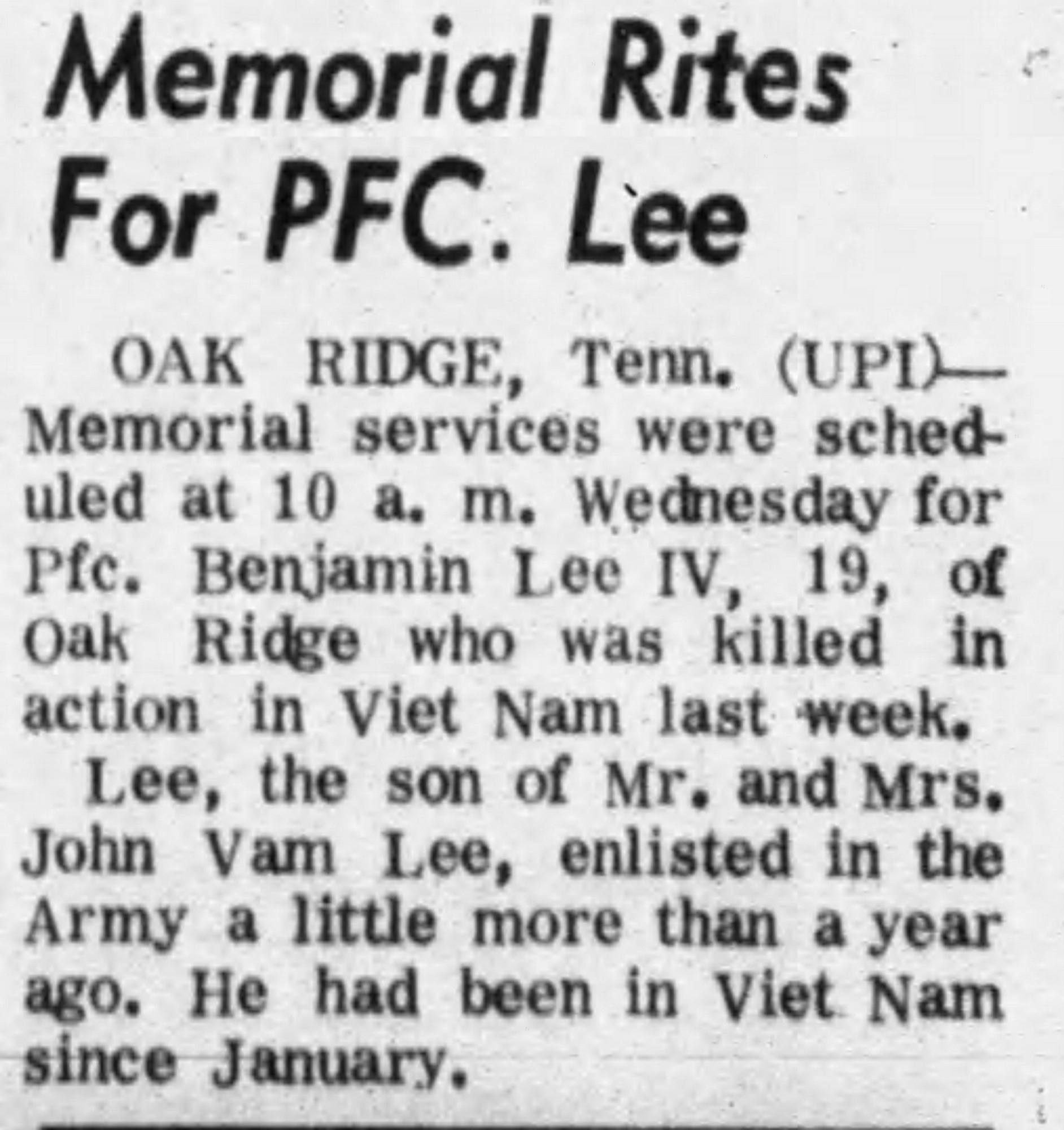 Benjamin Lee IV was born in Oakridge, Montgomery County, Tennessee. He had been in Vietnam since January and was a Medic. He was killed in action while serving with the HHC/1/35th Infantry Regiment, 25th Infantry Division, U.S. Army.