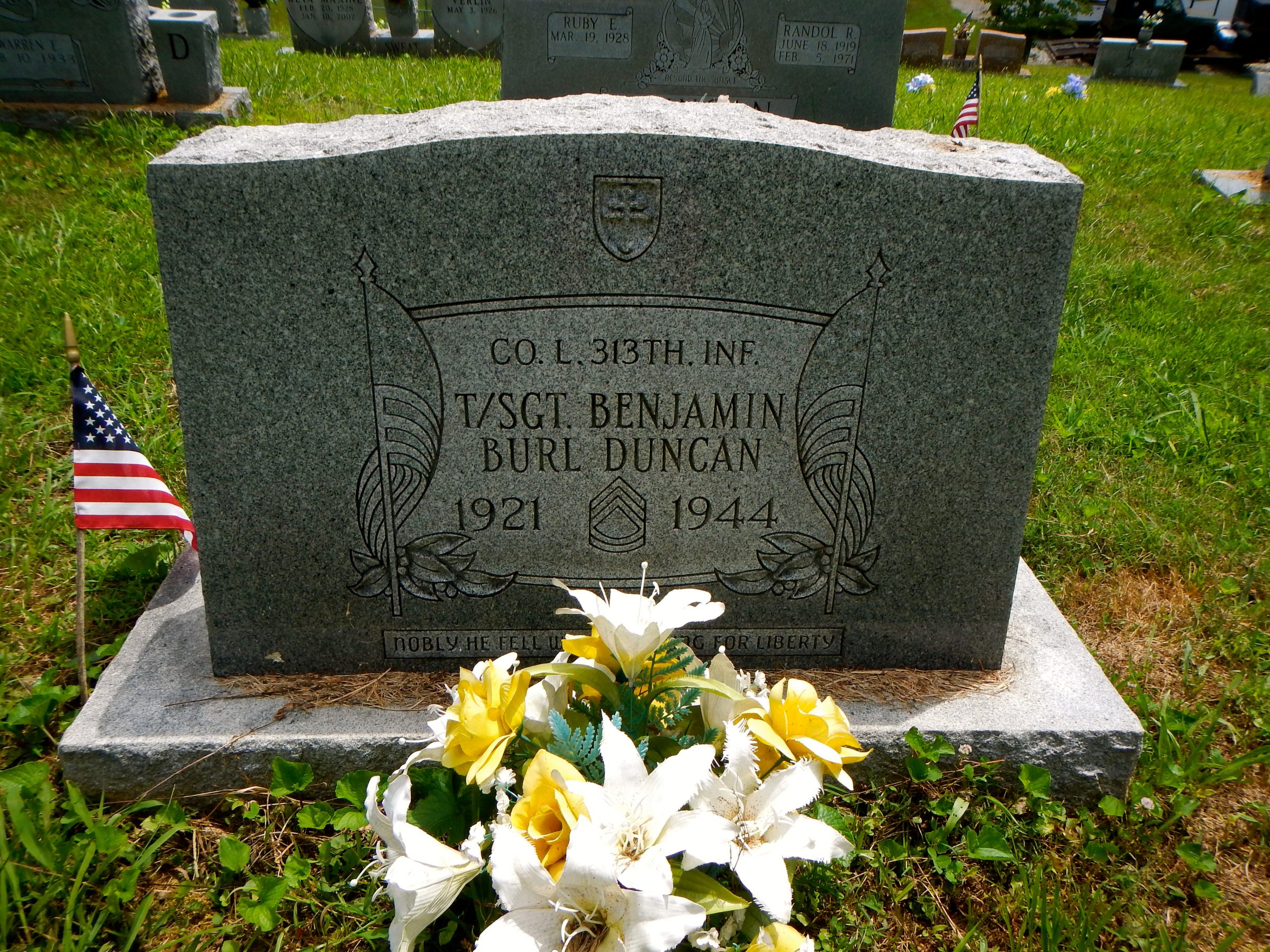 Benjiman (also Benjamin) Duncan was born around 1922 in Tennessee. He enlisted on 11 June 1942 at Camp Forrest in Tennessee. He served as machine gunner, Company L, 313th Infantry, and died of wounds due to land mine; he lost both legs after the Normandy landing in the town of Cherbourg, France in 1944.