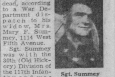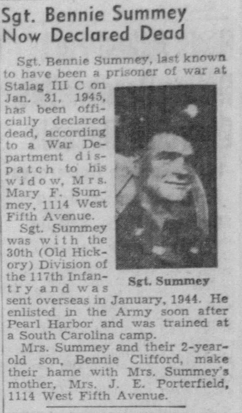 Sgt. Bennie Summey, last know to have been a prisoner of war at Stalag II C on Jan. 31, 1945, has been officially declared dead, according to a War Departent dispatch to his widow, Mrs. Mary F. Summey, 1114 West Fifth Avenue. Sgt. Summey was with the 30th (Old Hickory) Division of the 117th Infantry and was sent overseas in January, 1944. He enlisted in the Army soon after Pearl Harbor and was trained at a South Carolina camp. Mrs. Summey and their 2-year-old son, Bennie Clifford, make their home with Mrs. Summey’s mother, Mrs. J.E. Porterfield, 1114 West Fifth Avenue.