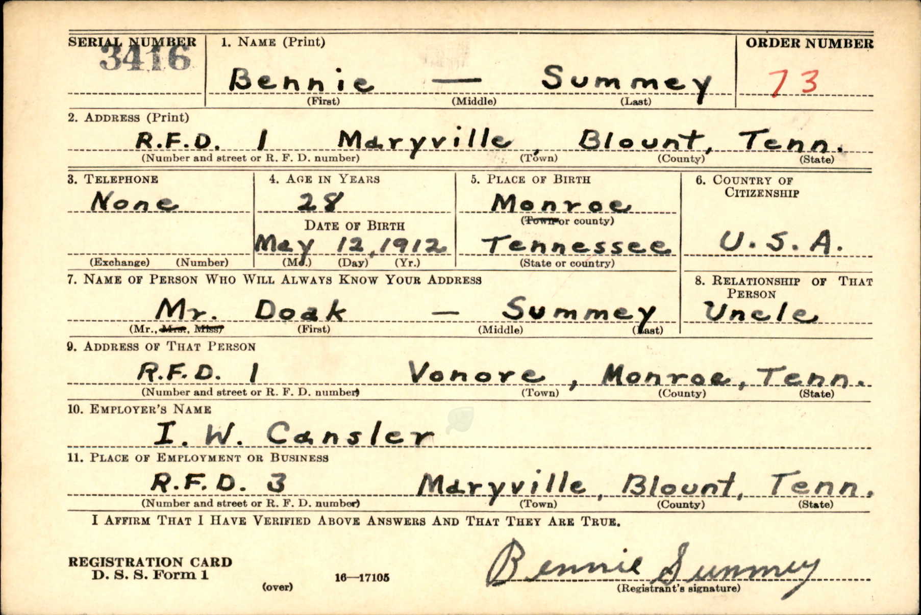 Sergeant Bennie Summey was born in 1912. He was the son of William Summey and Mary Elizabeth Hunt. He had four siblings, Reba Summey, Dutch Summey, Virgil Summey, and Mike Summey. He enlisted in the military on January 14, 1941 in Fort Oglethorpe, Georgia. He served in the European theater of war with the 117th Infantry Regiment, 30th Infantry Division. He fought in Northern France, where he was taken prisoner of war by the Germans on August 7, 1944. He died as a prisoner of war. Although his exact death date is unknown, he was officially declared dead on Friday, March 1, 1946. Sergeant Summey was awarded a Bronze Star for his tremendous service in World War II.