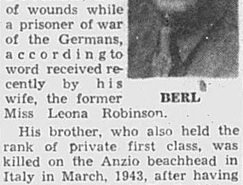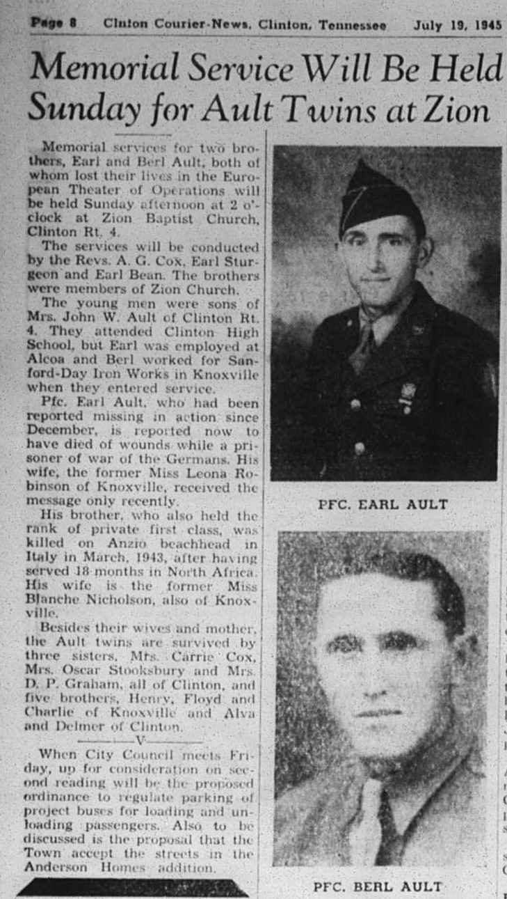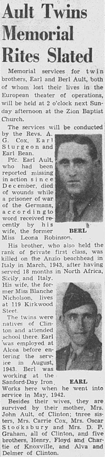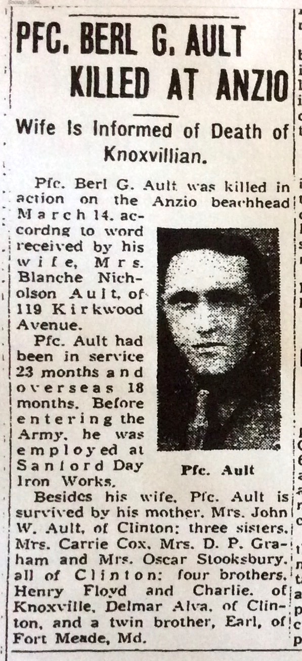 Pfc. Bert Ault was killed on Anzio beachhead in Italy in March, 1943, after having served 18 months in North Africa. His wife is the former Miss Blanche Nicholson, of Knoxville.