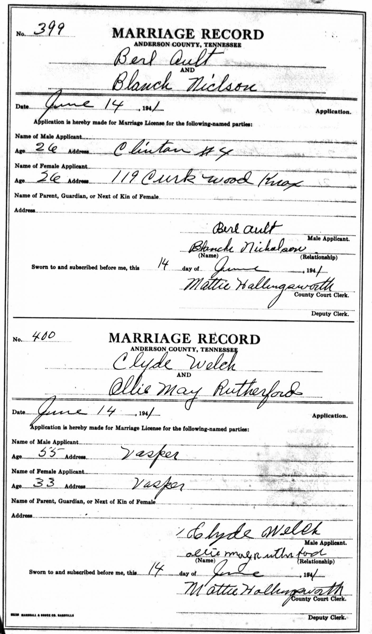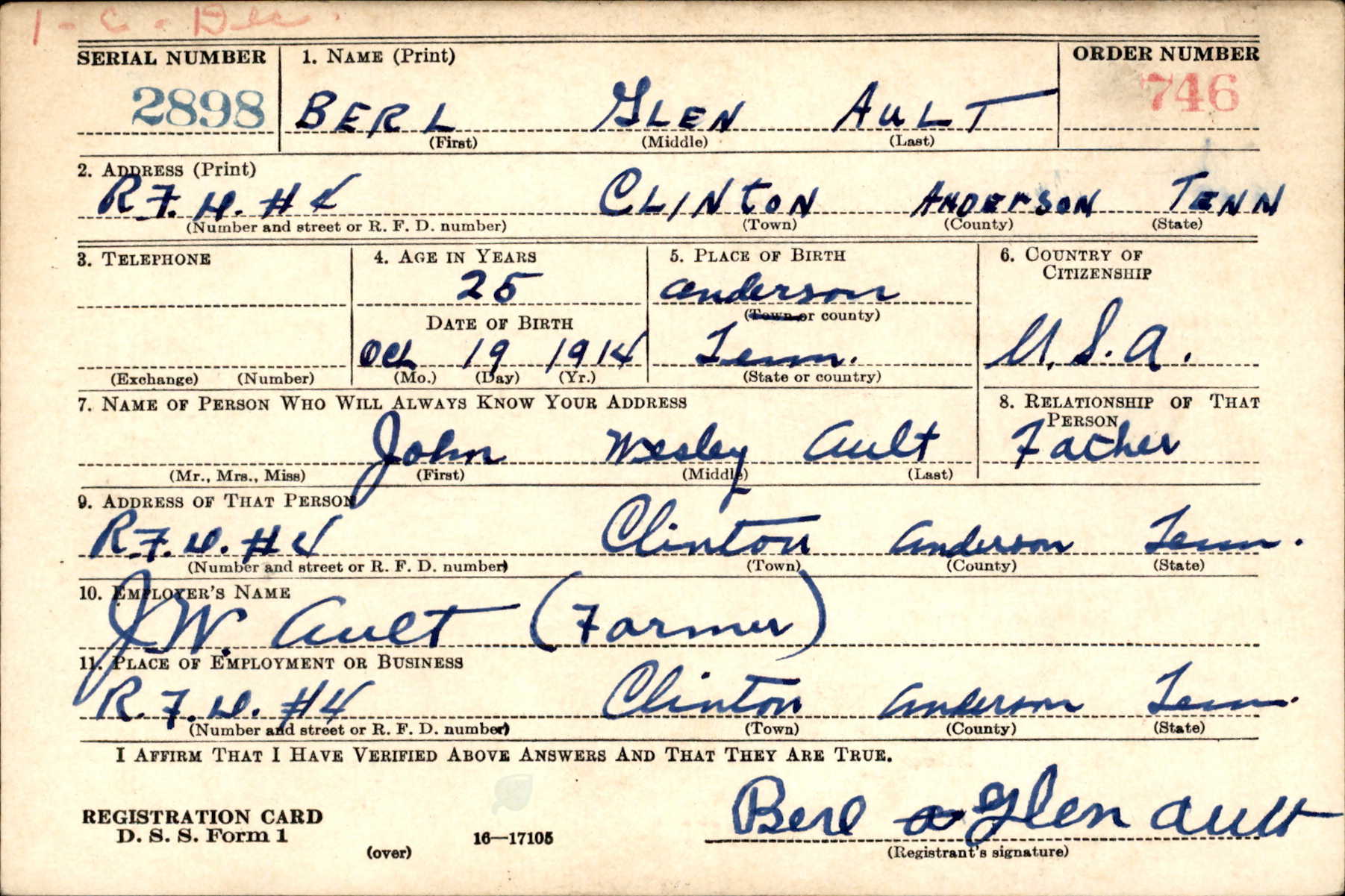 Berl Glen Ault was born on 19 October 1914. Son of John and Mary Ault of Anderson County, TN