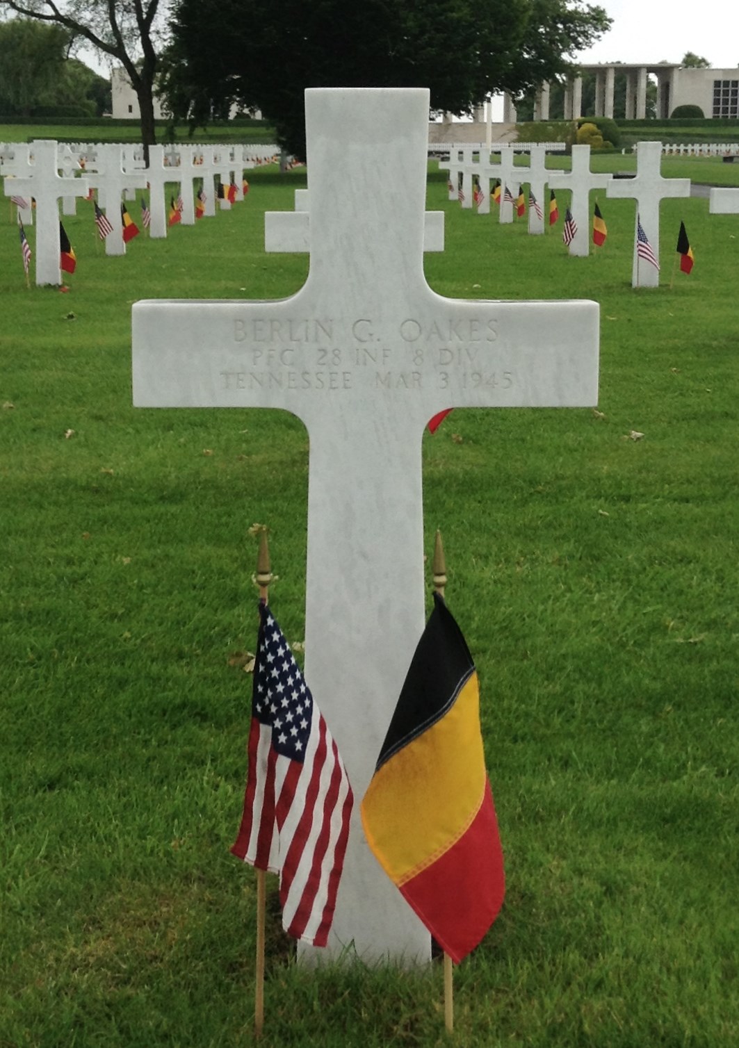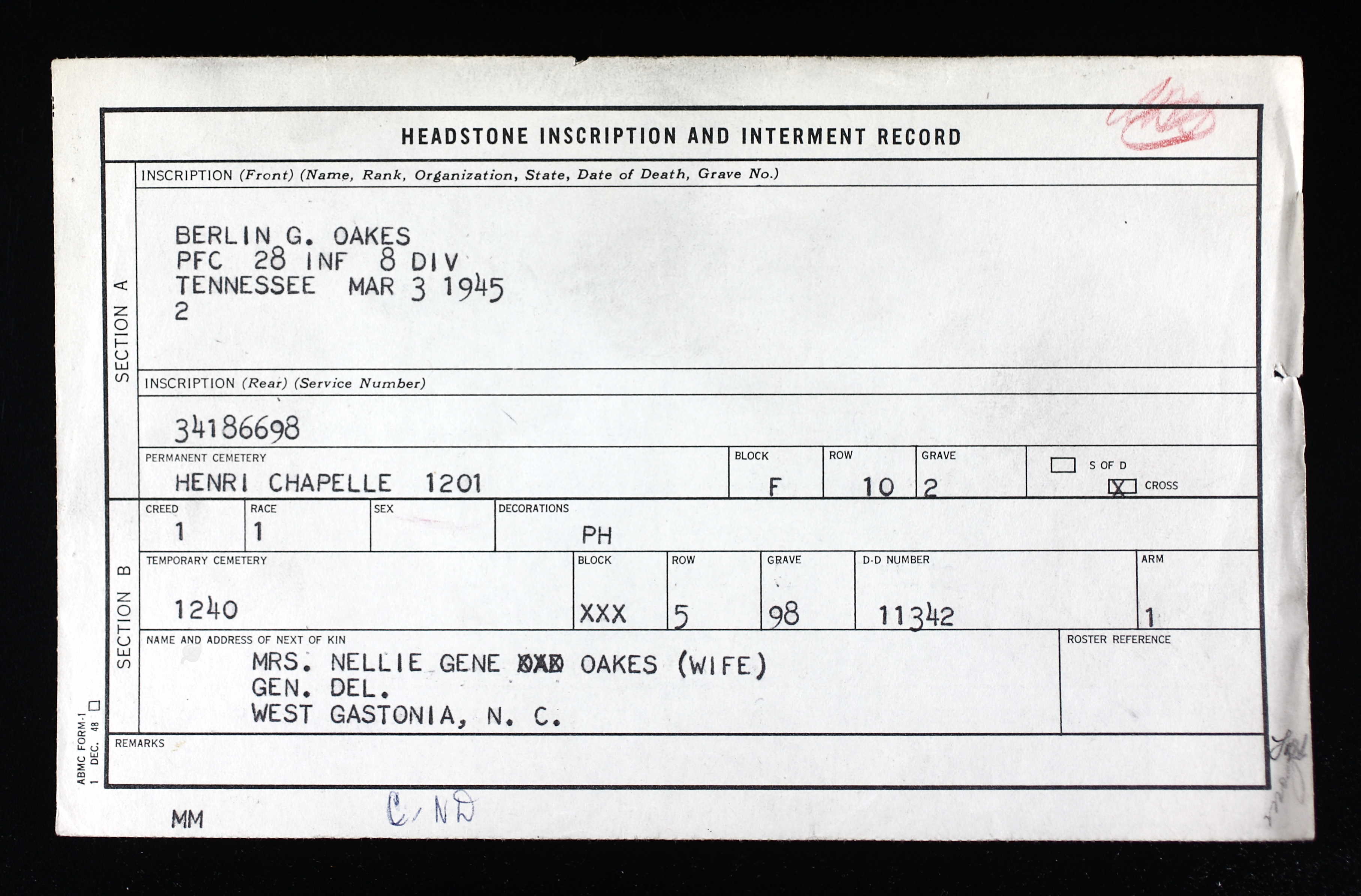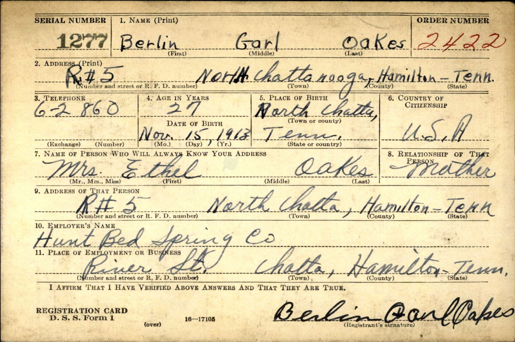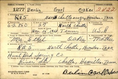 One Chattanoogan yesterday was reported killed in action in Germany. A former employe of the Hunt Bed Spring Company, Pfc. Berlin G. Oakes, son of Mrs. Ethel Oakes, and husband of Mrs. Nellie Oakes, 29 Sawyer Street, was killed in action in Germany, March 3, his wife was officially notified. In the service three years and overseas for the past 10 months, Pfc. Oakes, former student at Hixson High School, was the father of Marilyn Oakes, 2. His military duties were not disclosed. He is survived by his wife; mother; three sisters, Mrs. Eula Jones, Lucille Hysler and Mrs. Della Nichols, all of Chattanooga; one brother, Harold Oakes, Portland, Ore.; two half-sisters, Miss Gladys Mowry, Chicago, and Mrs. Maggie Jones of west Virginia; two half-brothers, Clarens C. Oakes and Condra W. Oakes, both of Chattanooga.