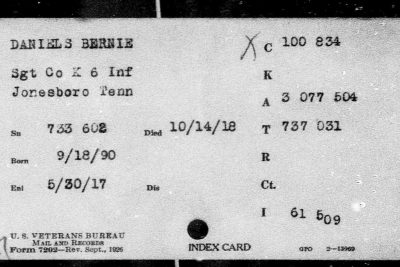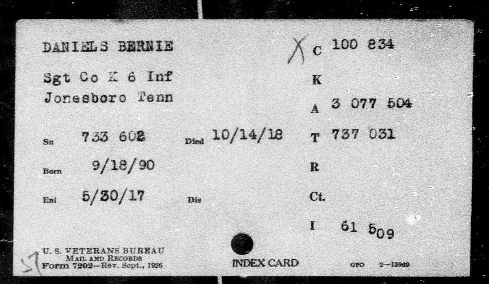 Bernie was born in Erwin, Unicoi County, Tennessee on 18 September 1890, but grew up in Jonesborough, Washington County, Tennessee. He and his family called Jonesborough home. Bernie enlisted in the United States Army on 28 April 1908 at Columbus Barracks, Columbus, Ohio at the age of 17. He did fib a little, said he was born in 1888 and was 19.