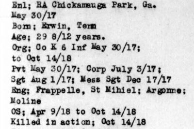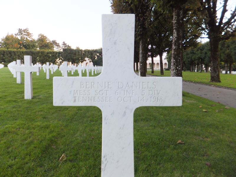 Bernie fought in four unit campaigns: Anould Sector, St. Die Sector, St. Mihiel Offensive and the Argonne-Meuse Offensive. It was during St. Mihiel that the division ended up with the nickname they carry even today. For their actions the Germans started calling them “Der Rote Teufel” which means The Red Devils. Bernie now a Red Devil is credited for fighting in four engagements as well: Frappelle, St. Mihiel, Argonne and Moline. On 14 October 1918 during the Argonne-Meuse Offensive near Bois Des Rappes, France, Bernie was hit by German machine gun fire in the Argonne Forest and killed. He was 28 years old and now rests in the Meuse-Argonne American Cemetery, Plot F, Row 21, Grave 40 in Romagne, France.