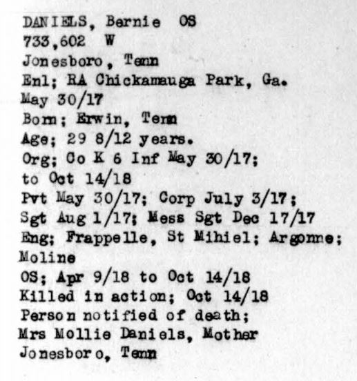 Bernie was the first son of John Henry Daniels and Mary “Mollie” Elizabeth Brooks. His three brothers also served in the United States Army, William in the Philippines prior to WWI, Ira was with Bernie in Company K during WWI and Sherman right after WWI in 1919. Sherman also served during World War II.