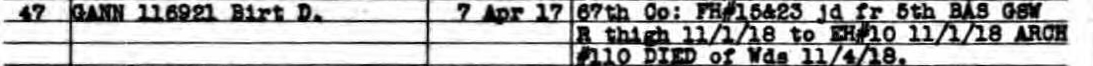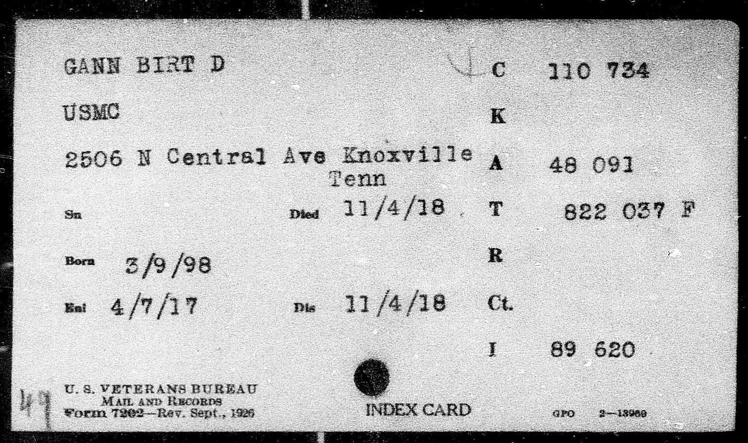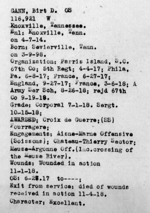 Bert (Birt) Davis Gann enlisted in the U.S. Marines at Knoxville on April 2, 1917, and was assigned to the 67th Company, 5th Regiment, Second Infantry Division, with which he sailed in June 1917 to France. He was in the Chateau Thierry and other battles of his organization until November 1, 1918, when he was wounded, dying three days later. Awarded the French Croix de Guerre with one star.