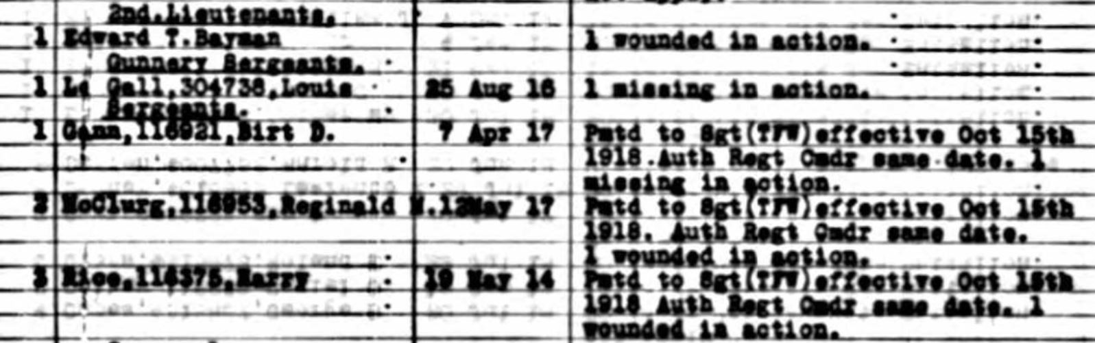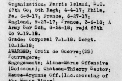 - Battles: Airne-Marne Offensive (Soissons), Chateau Thierry Sector, Meuse-Argonne Offensive