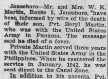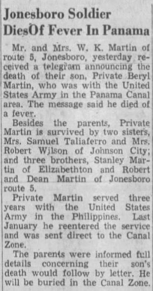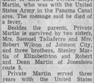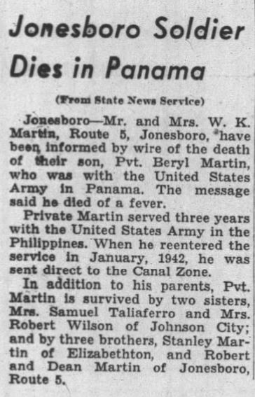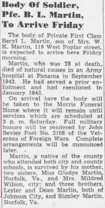 The body of Private First Class Beryl L. Martin, son of Mrs. W.K. Martin, 119 West Poplar street, is expected to arrive here Friday morning. Martin, who was 28 at death, died of natural causes in an army hospital at Panama in September, 1942. He had served a prior enlistment and had reenlisted in January 1942. Martin, a native of the county who attended both city and county schools, is survived by his mother, two sisters, Miss Gladys Martin, Norfolk, Va. And Mrs. Mildred Wilson, city; and three brothers, Lester and Dean Martin, both of Johnson City, and Stanley Martin, Norfolk, Va.