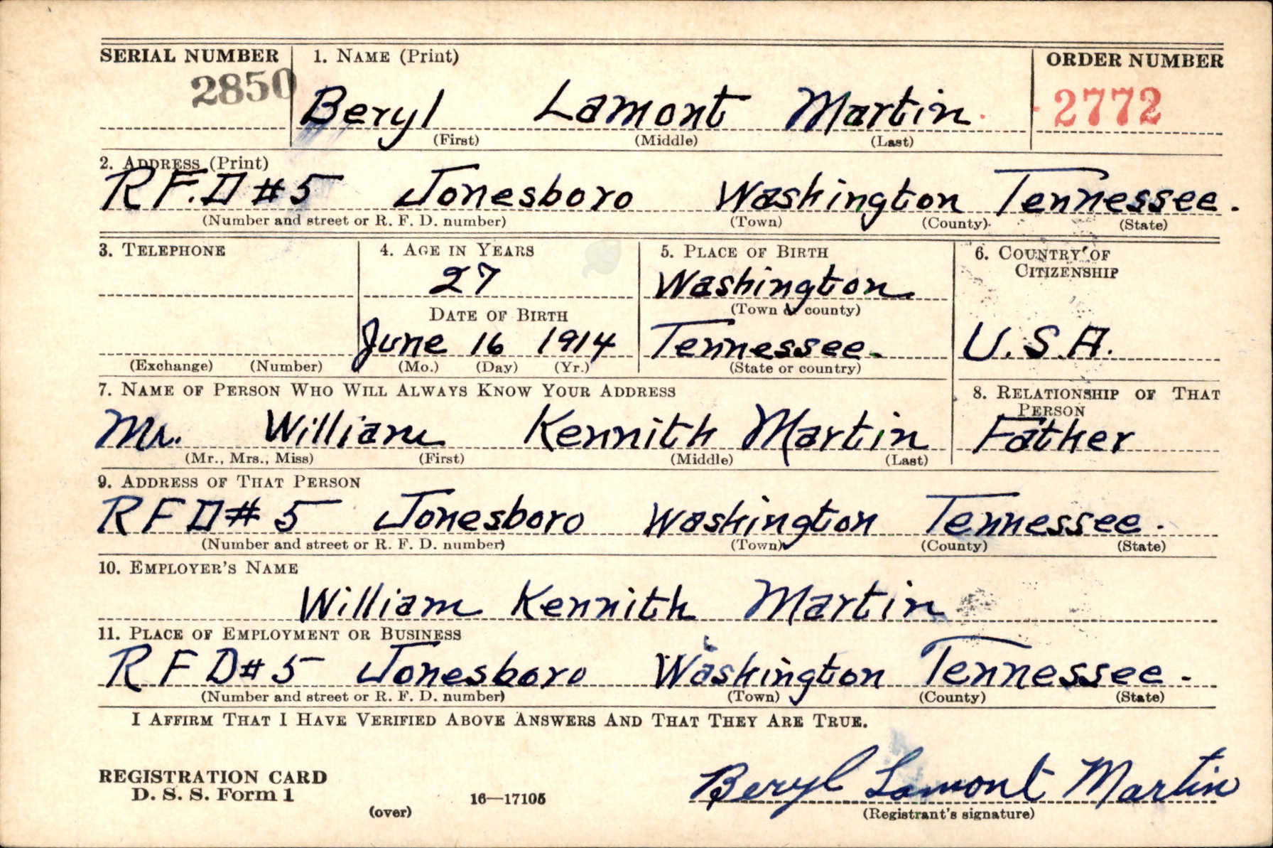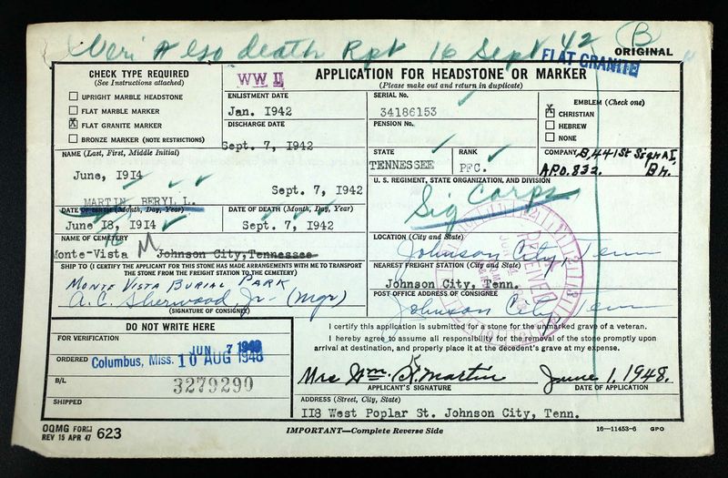 Beryl Lamont Martin was born on 16 June 1914 at Jonesborough, Tennessee, the son of William Kenneth Martin and Mary Elizabeth Hall.