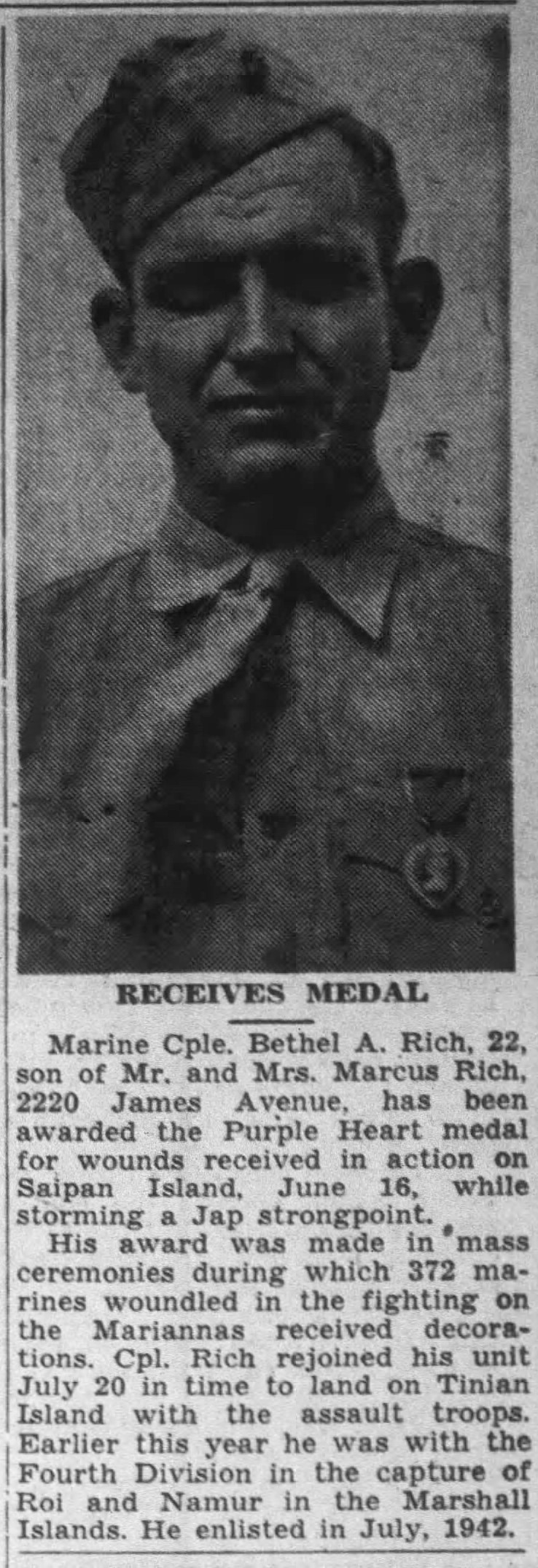 Marine Cple Bethel A. Rich, 22, son of Mr. and Mrs. Marcus Rich, 2220 James Avenue, has been awarded the Purple Heart medal for wounds received in action on Saipan Island, June 16, while storming a Jap strongpoint. His award was made in mass ceremonies during which 372 marines woundled in the fighting on the Mariannas received decorations. Cpl. Rich rejoined his unit July 20 in time to land on Tinian Island with the assault troops. Earlier this year he was with the Fourth Division in the capture of Roi and Namur in the Marshall Islands. He enlisted in July, 1942.