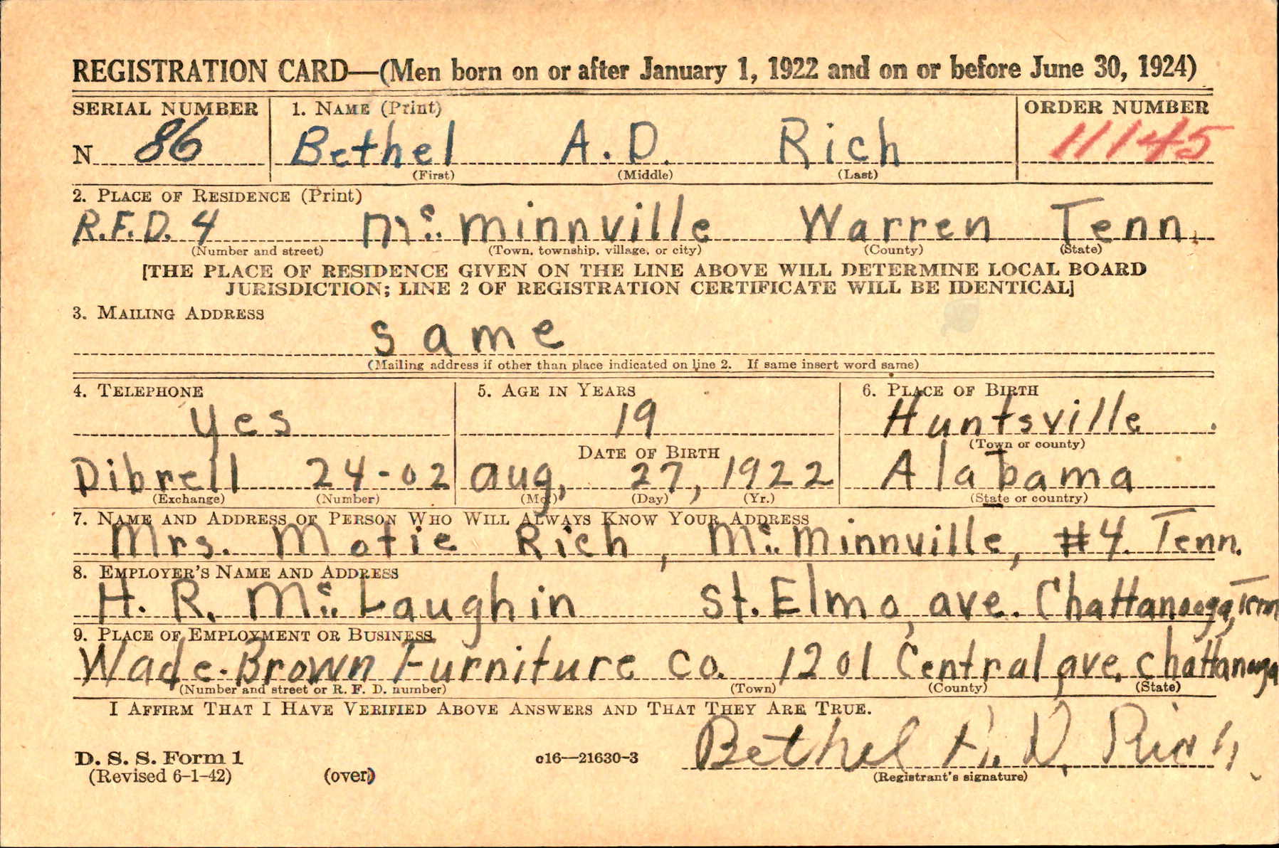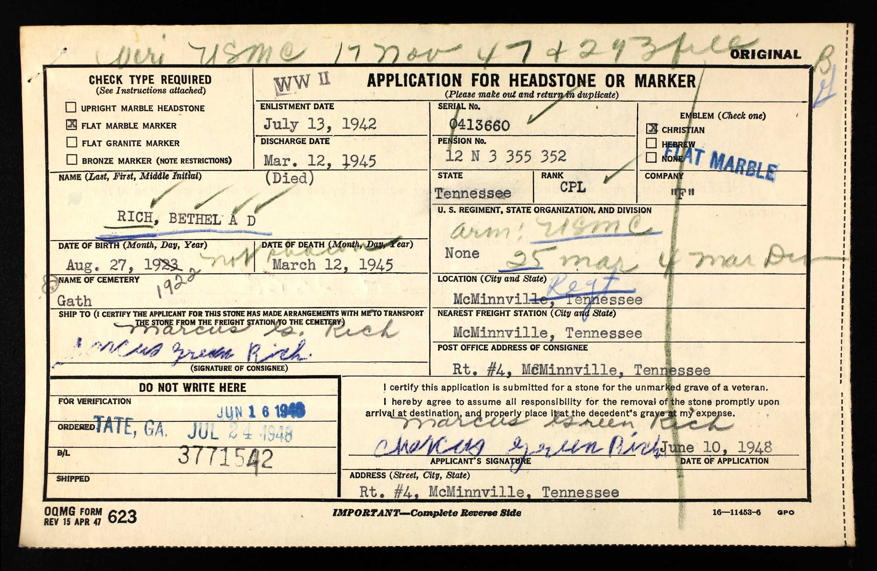 Bethel A.D. Rich was born on 27 August 1922 at Huntsville, Alabama, the sof Marcus Green Rich and Motie Gertrude Kelley.