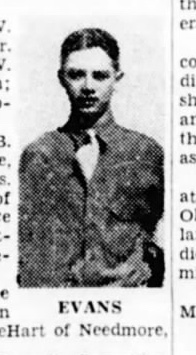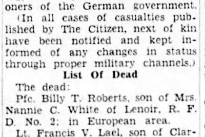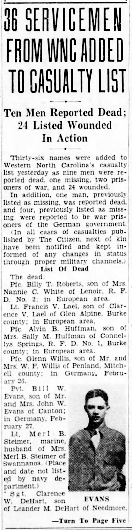 Pvt. Bill W. Evans, son of Mr. and Mrs. John W. Evans of Canton was killed in Germany, February 27. Pvt. Evans, who formerly was employed by the American Cleaners in Canton, entered service in September, 1943, and had been overseas more than four months, during which time he served in England, France, and Belgium. He received training at Camp Pickett, Va., and Fort Bragg. Surviving in addition to the parents, are three brothers, Sgt. Joe S. Evans, in Germany, Cpl. John J. Evans in Burma and Tommie Ray Evans of Canton, and four sisters, Mrs. Flora Clark, Mrs. Bill Shytles and the Misses Minnie and Netta Evans, all of Canton.