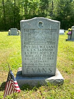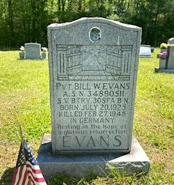 Bill W. Evans was born on 20 July 1925 in Haywood County, North Carolina. He was the son of John Washington Evans and Etta Clark.He was killed in action in Germany and is buried at Piney Cemetery, Oakdale, Morgan County, Tennessee.