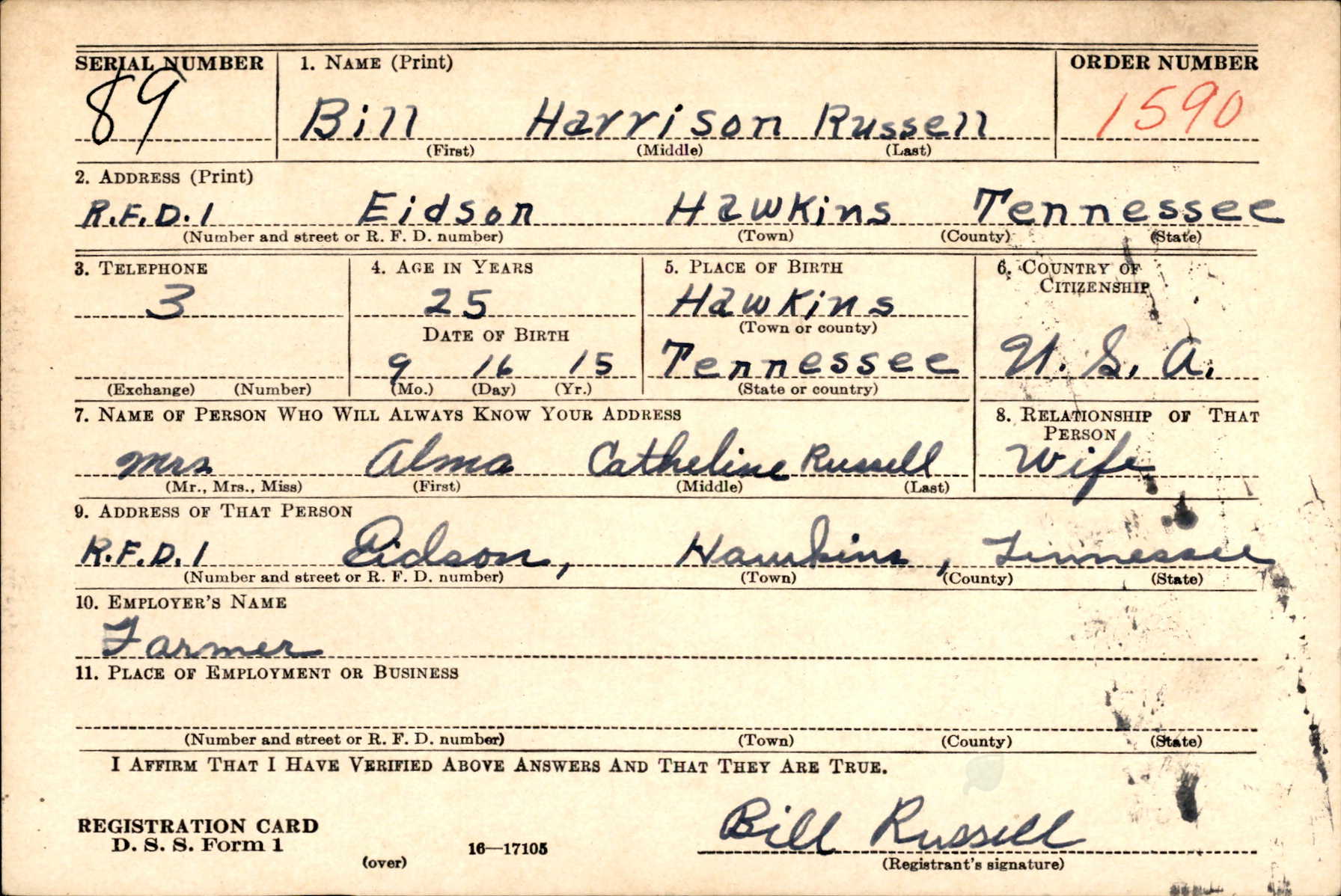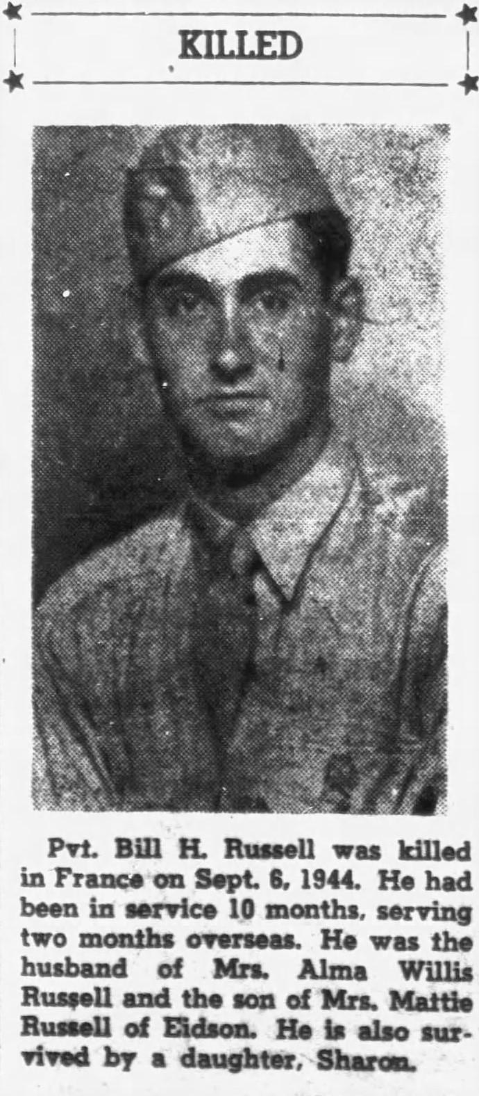 William “Bill” Harrison Russell was the son of William J. Russell and Martha “Mattie” Stapleton. Husband of Alma Catharine Willis and father of Sharon Russell.
