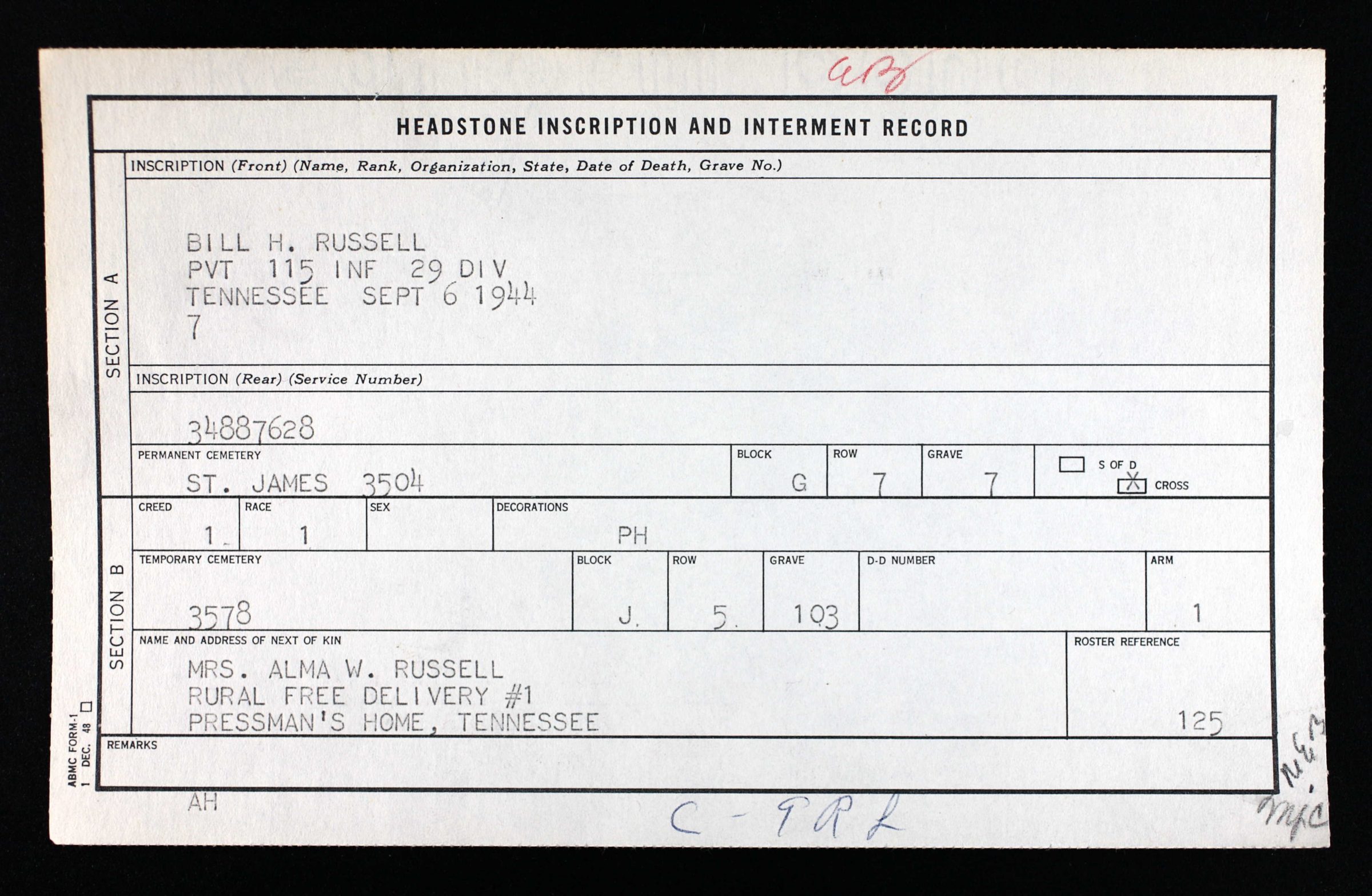 He had been in the Army 10 months and overseas 2 months. He was killed in action in France. Buried at Brittany American Cemetery, St. James (Manche), France, G, 7, 7