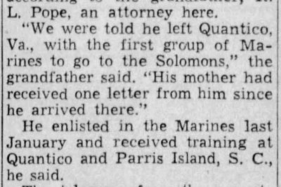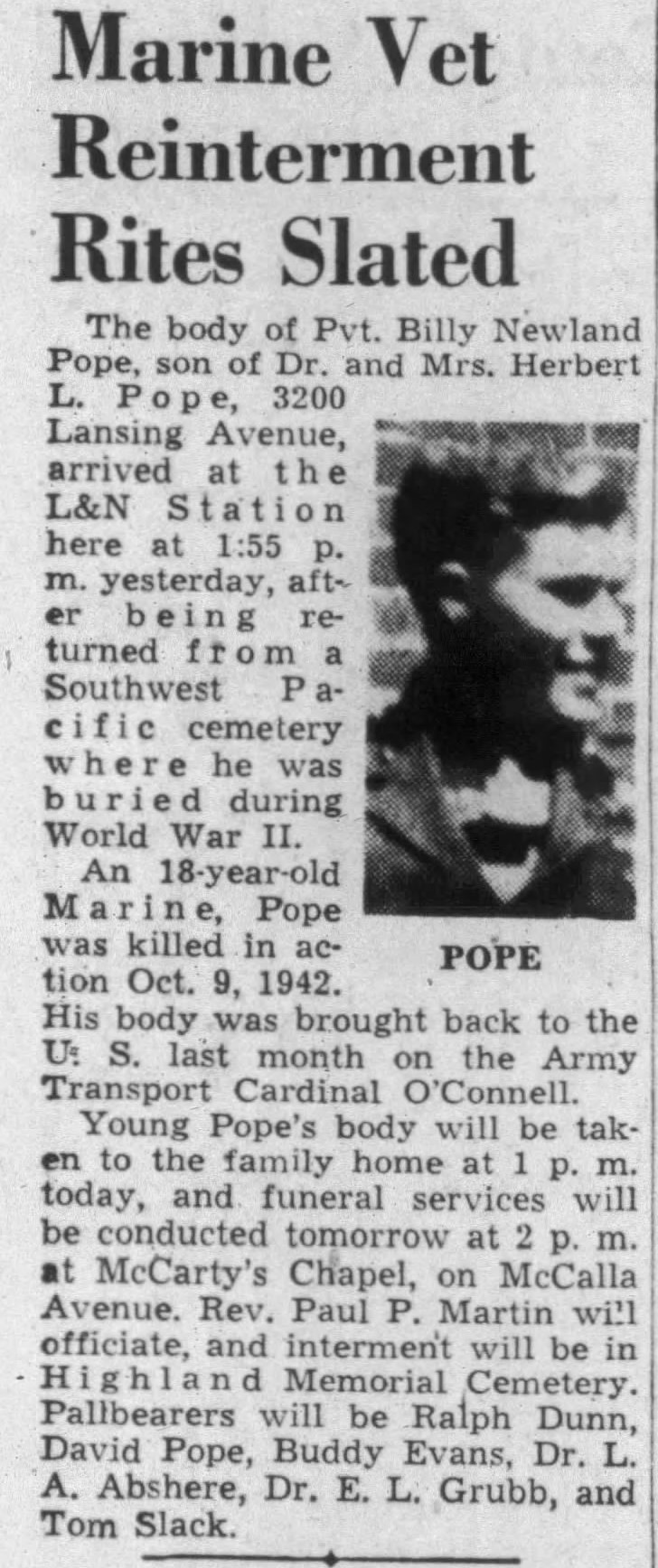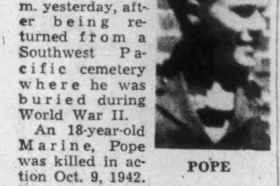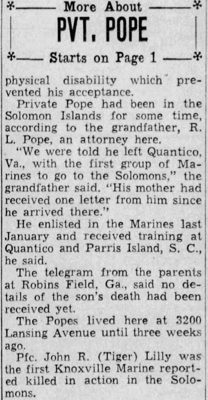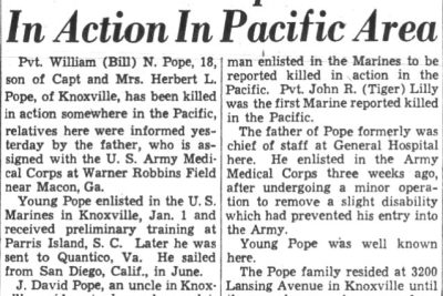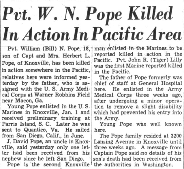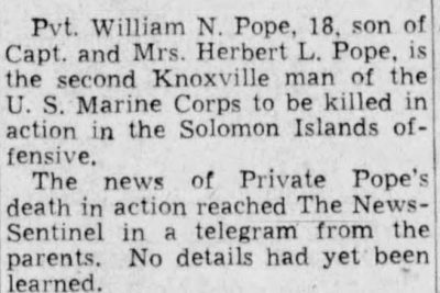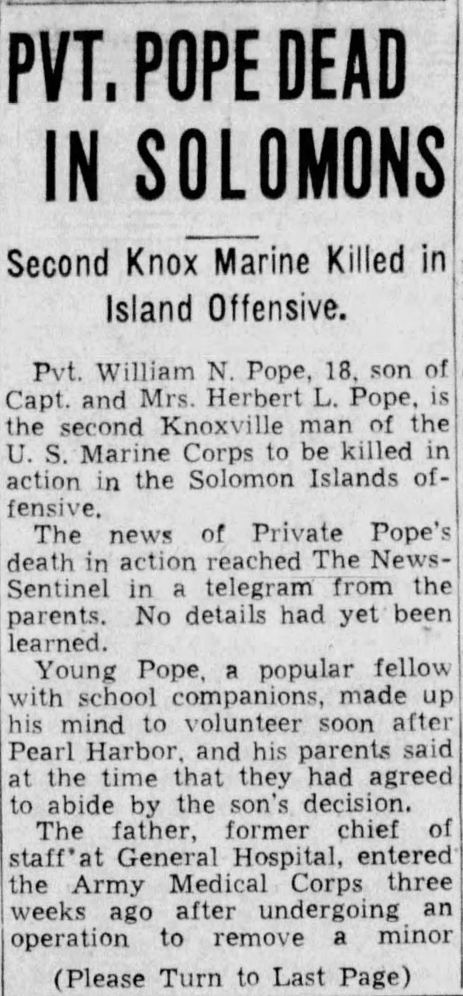 Pvt. William N. Pope, 18, son of Capt. And Mrs. Herbert L. Pope, is the second Knoxville man of the U.S. Marine Corps to be killed in action in the Solomon Islands offensive. The news of private Pope’s death in action reached The News-Sentinel in a telegram from the parents. No details had yet been learned. Young Pope, a popular fellow with school companions, made up his mind to volunteer soon after Pearl Harbor, and his parents said at the time that they had agreed to abide by the son’s decision. The father, former chief of staff at General Hospital, entered the Army Medical Corps three weeks ago after undergoing an operation to remove a minor physical disability which prevented his acceptance. Private Pope had been in the Solomon Islands for some time, according to the grandfather, R.L. Pope, an attorney here. “We were told he left Quantico, Va., with the first group of Marines to go to the Solomons,” the grandfather said. “His mother had received one letter from him since he arrived there.” He enlisted in the Marines last January and received training at Quantico and Parris Island, S.C., he said. The telegram from the parents at Robins Field, Ga., said no details of the son’s death had been received yet. The Popes lived here at 3200 Lansing Avenue until three weeks ago.