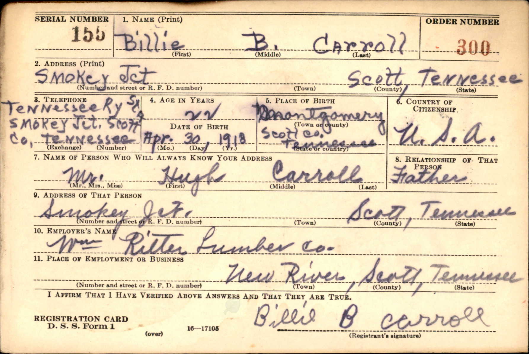 Billie B. Carroll was born 30 April 1918 in Montgomery, Tennessee. He was the son of Hugh Carroll and Lottie Lowe. He was married to Bertie “Birda” Lowe