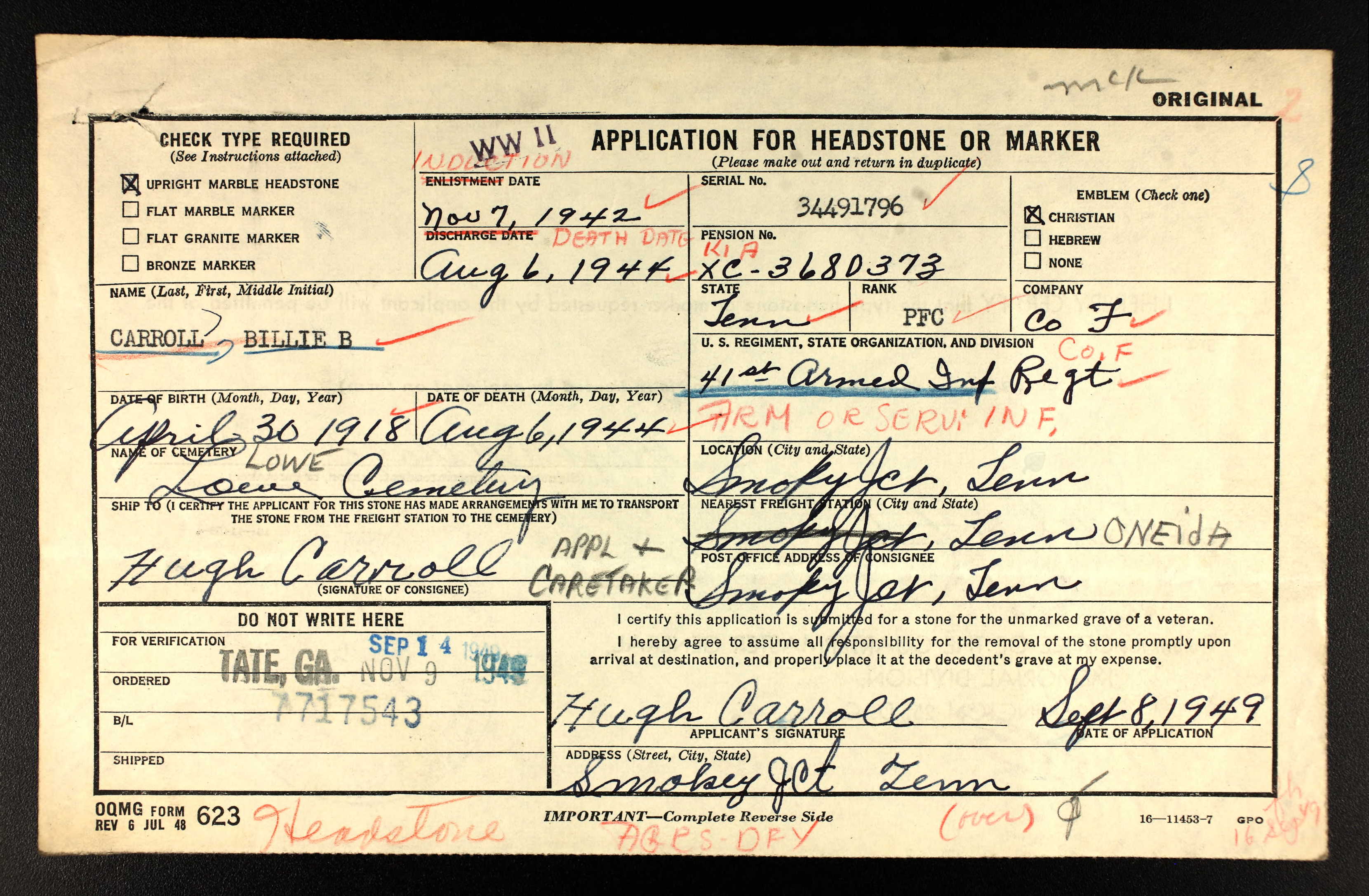 PFC Carroll was killed in action in France on August 6, 1944.