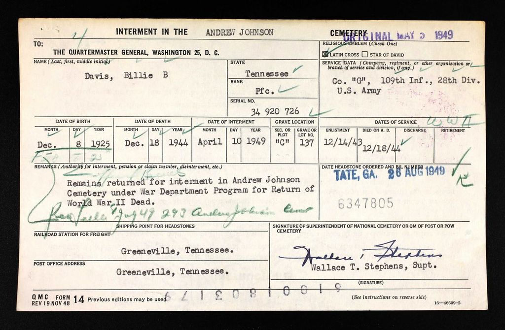 - Burial/Memorial Location: Andrew Johnson National Cemetery, Greeneville, Greene County, TN