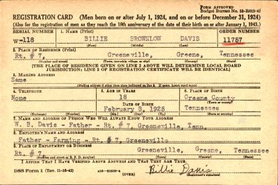 Billie Brownlow Davis was born 8 December 1925, the son of William Brownlow Davis and Manilla Gertrude Darnell.