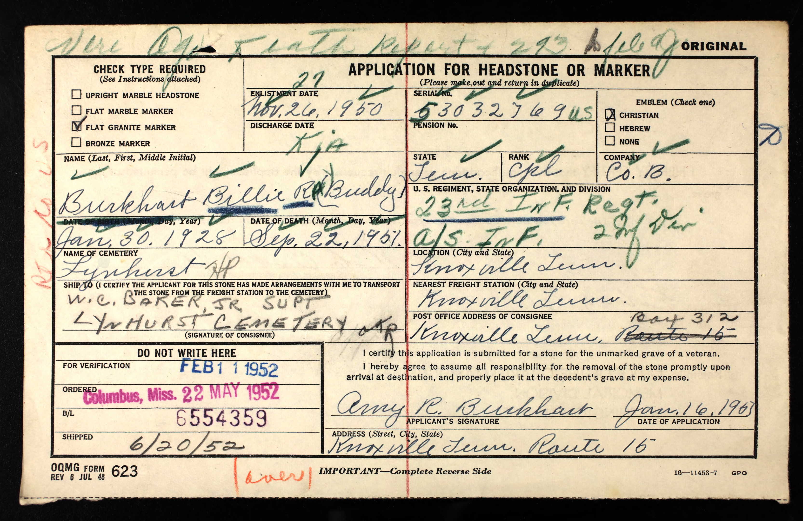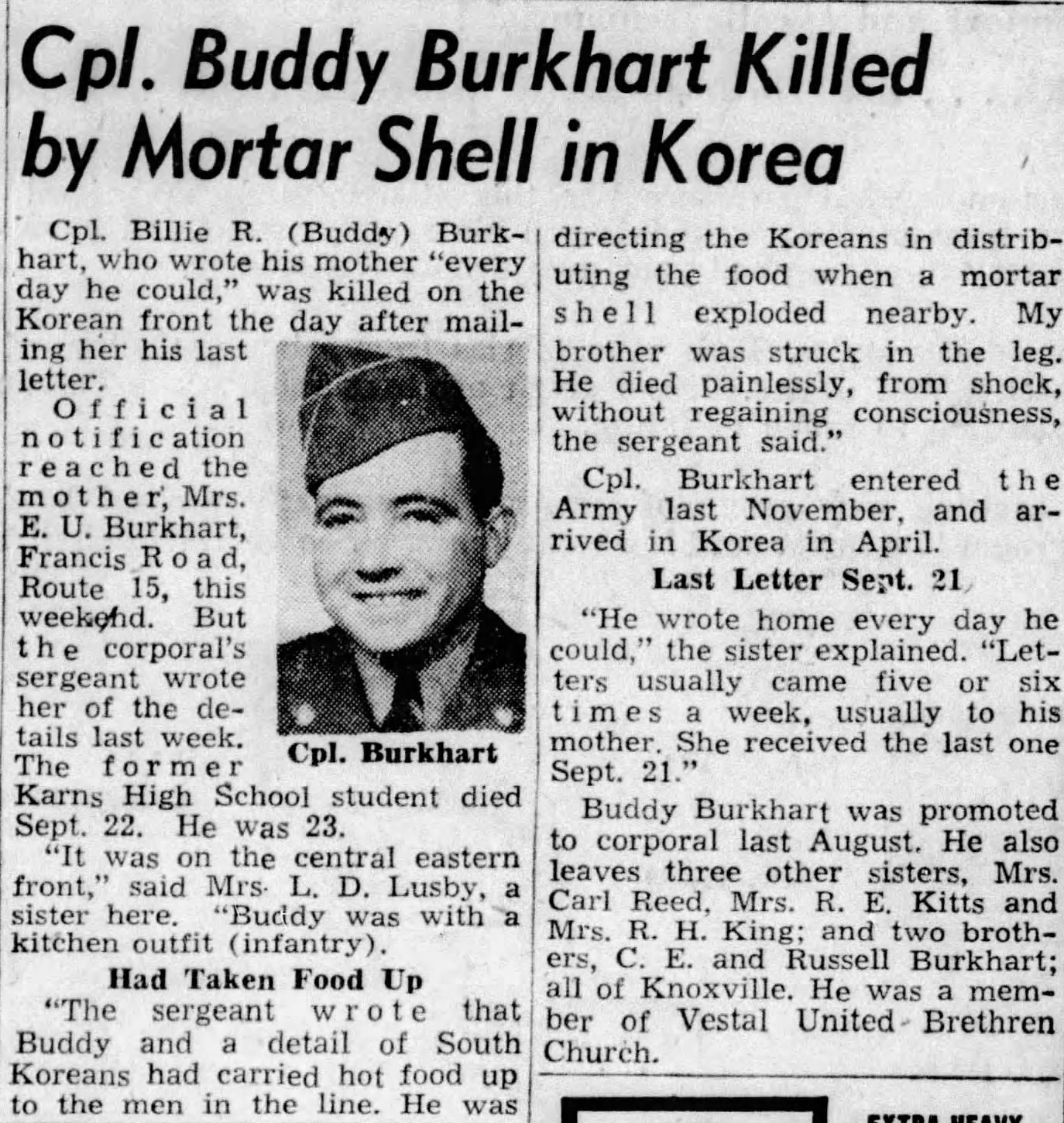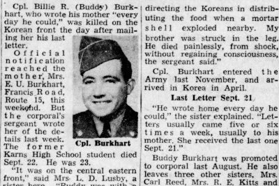 Corporal Burkhart was transported back to the United States aboard the troop transport Loma Victory and arrived in San Francisco just before Christmas 1951. His family was notified of his arrival and funeral services were scheduled and held on January 13, 1952, at Middlebrook Pike Baptist Church. Corporal Burkhart was laid to rest following the service in Lynnhurst Cemetery. Full military honors were given at the graveside by American Legion Post # 2.