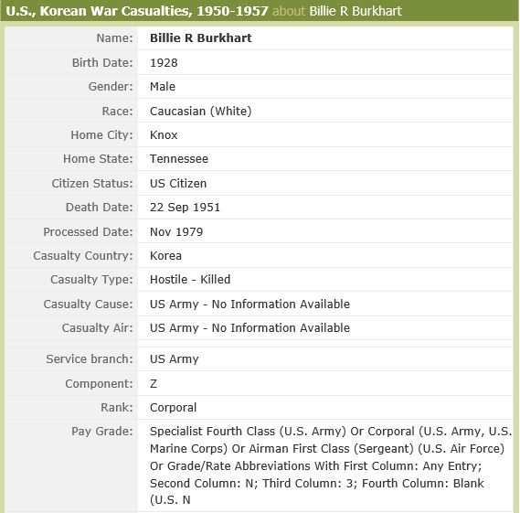 The Battle of Heartbreak Ridge was one of several major engagements in an area known as The Punchbowl. The attack started on September 13, 1951, when elements of the 9th Infantry and Corporal Burkhart’s 23rd Infantry attacked the North Korean position on several key hills. Hill 931 was the center of Heartbreak Ridge and the battle for that hill was still ongoing nine days later on September 22, 1951. Corporal Burkhart’s Regiment was engaged with the enemy and several times that day of heavy fighting the elements of the 2nd Division would fight their way to the crest of the hill only to be repulsed by the enemy with heavy machine gun fire, mortar fire, and grenades hurled at their advancing positions. It was during one of the advances that Corporal Billie Ray Burkhart was killed in action on Heartbreak Ridge.