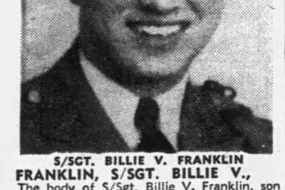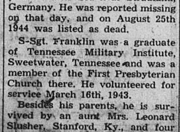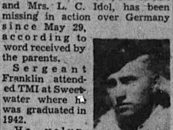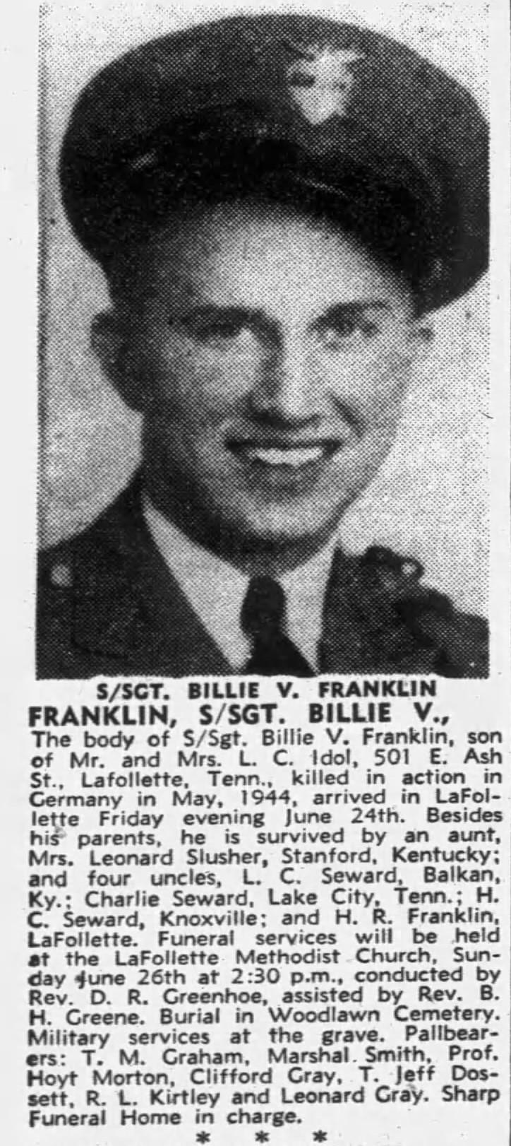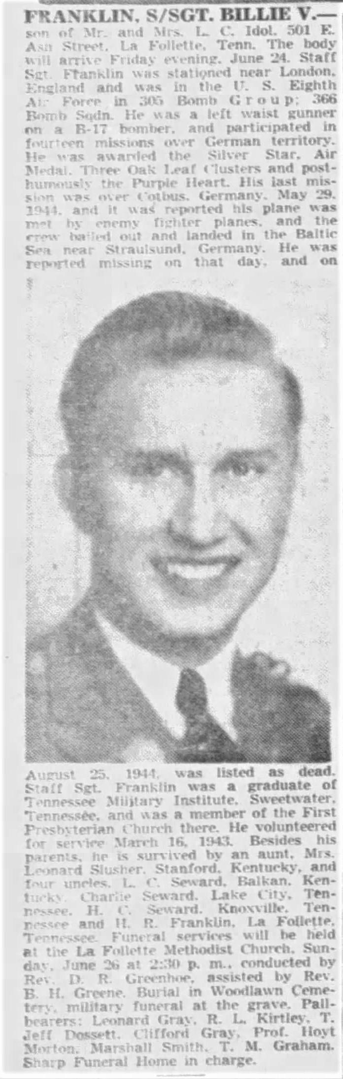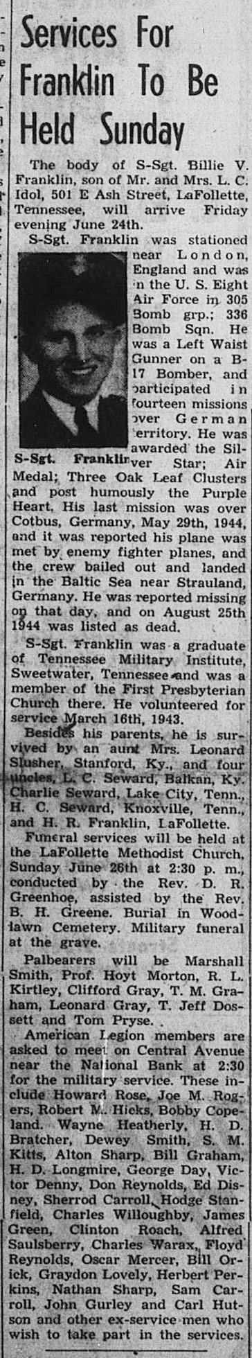 The body of S-Sgt. Billie V. Franklin, son of Mr. and Mrs. L.C. Idol, 501 E Ash Street, LaFollette, Tennessee will arrive Friday Evening June 24th. S-Sgt. Franklin was stationed near London, England and was in the U.S. Eight Air Force in 305 Bomb grp.; 336 Bomb Sqn. He was a Left Waist Gunner on a B-17 Bomber, and participated in fourteen missions over German territory. He was awarded the Silver Star; Air Medal; Three Oak Leaf Clusters and posthumously the Purple Heart. His last mission was over Cotbus, Germany, May 29th, 1944, and it was reported his plane was met by enemy fighter planes, and the crew bailed out and landed in the Baltic Sea near Strauland, Germany. He was reported missing on that day, and on August 25th 1944 was listed as dead. S-Sgt. Franklin was a graduate of Tennessee Military Institute, Sweetwater, Tennessee and was a member of the First Presbyterian Church there. He volunteered for service March 16th, 1943.