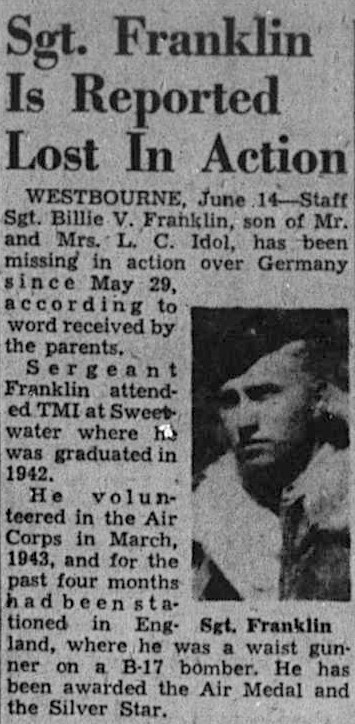 Westbourne, June 14 – Staff Sgt. Billie V. Franklin, son of Mr. and Mrs. L.C. Idol, has been missing in action over Germany since May 29, according to word received by the parents. Sergeant Franklin attended TM at Sweetwater where he was graduated in 1942. He volunteered in the Air Corps in March, 1943 and for the past four months had been stationed in England, where he was a waist gunner on a B-17 bomber. He has been awarded the Air Medal and the Silver Star.