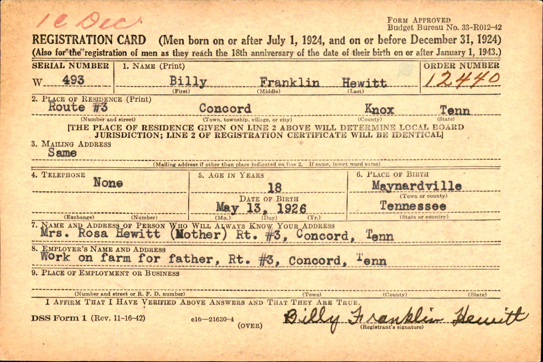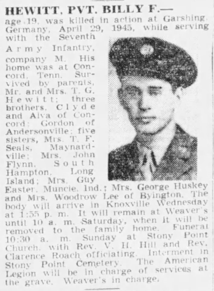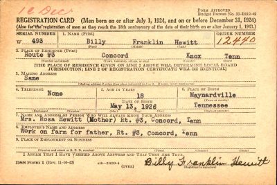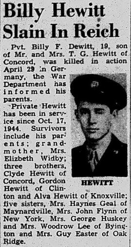 Billy Franklin Hewitt was born 13 May 1926 to Thomas Gordon Hewitt and Rosalie LeMarr