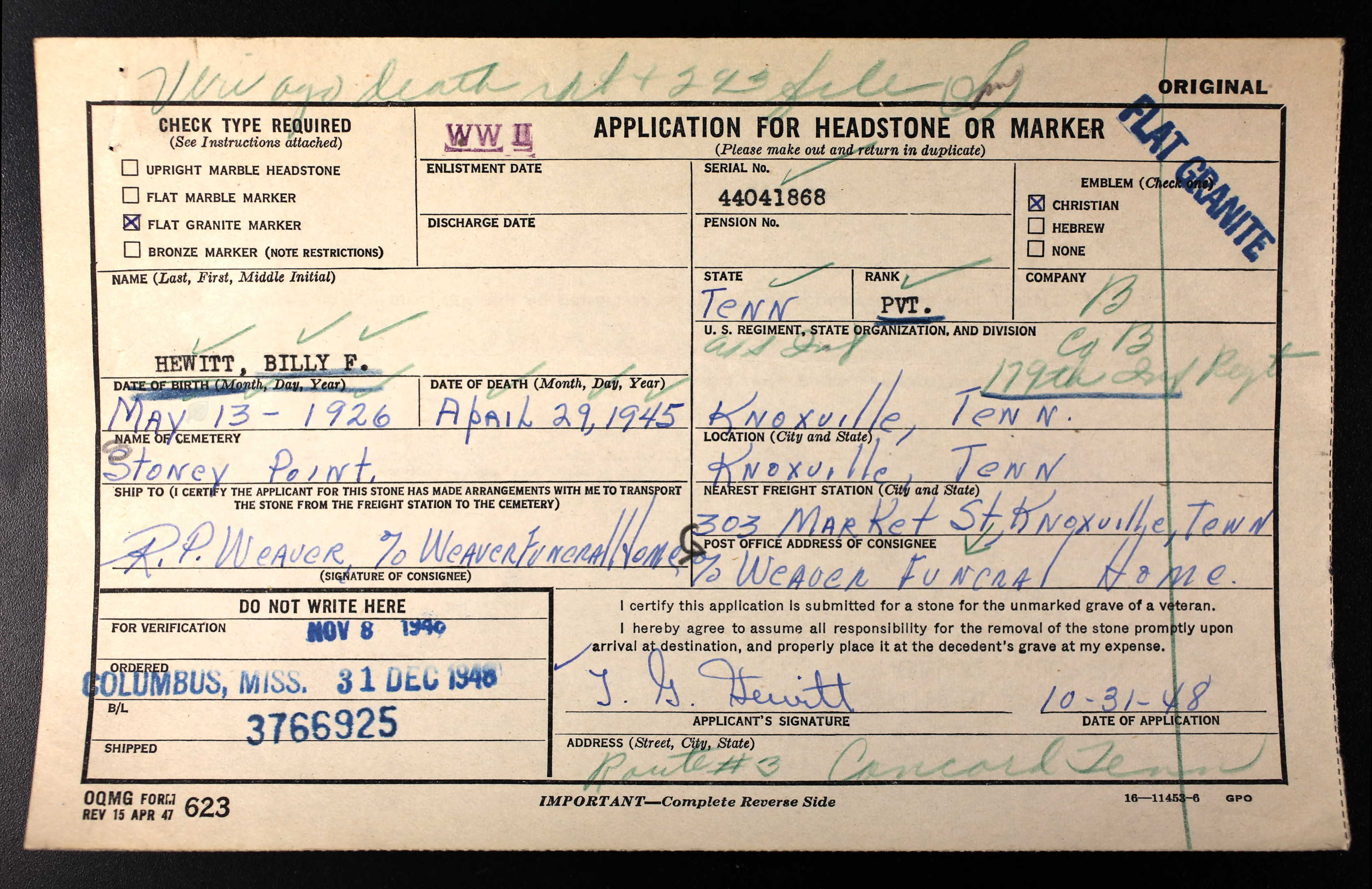 - Burial/Memorial Location: Stoney Point Cemetery, Knoxville, TN