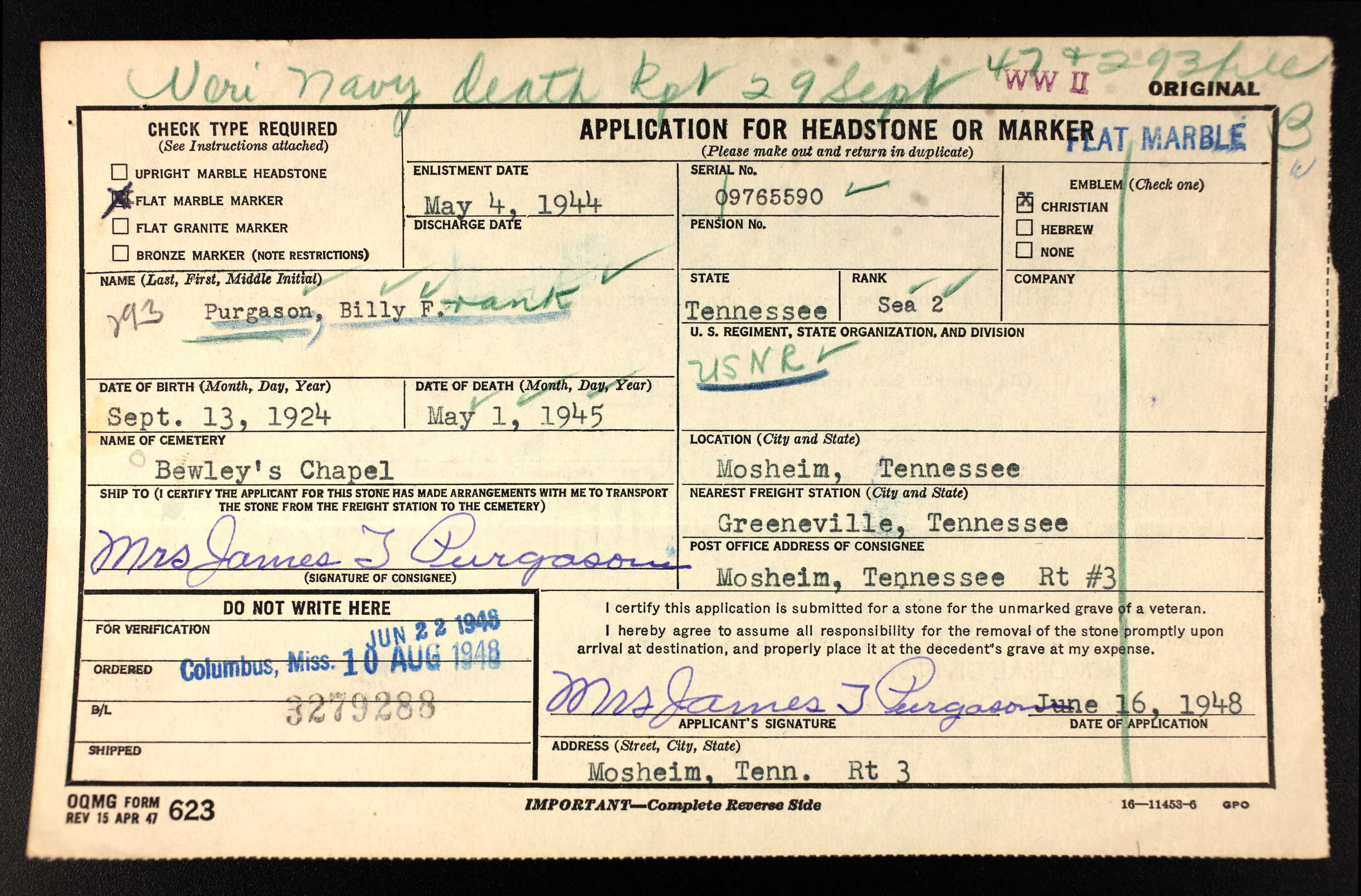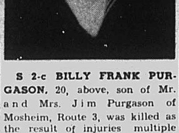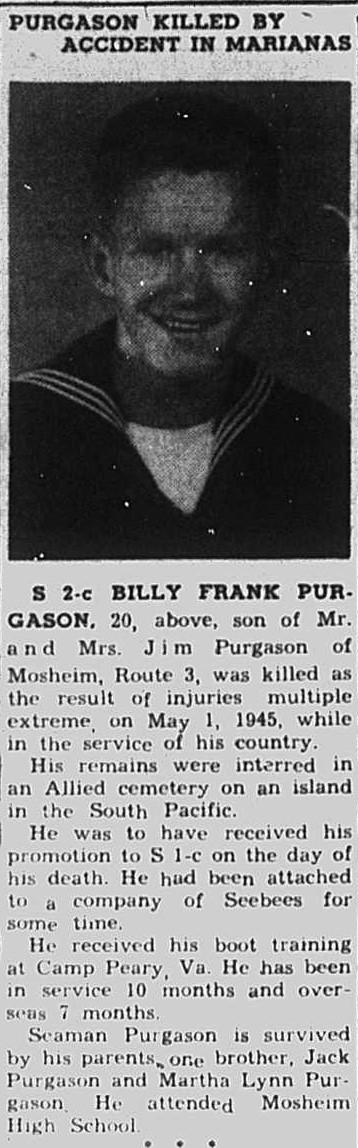 S 2-c Billy Frank Purgason, 20, son of Mr. and Mrs. Jim Purgason of Mosheim, Route 3, was killed as a result of injuries multiple extreme, on May 1, 1945, while in the service of his county. His remains were interred in an Allied cemetery on an island in the South Pacific. He was to have received his promotion to S 1-c on the day of his death. He had been attached to a company of Seebees for some time. Seaman Purgason is survived by his parents, one brother, Jack Purgason and Martha Lynn Purgason. He attended Mosheim High School.