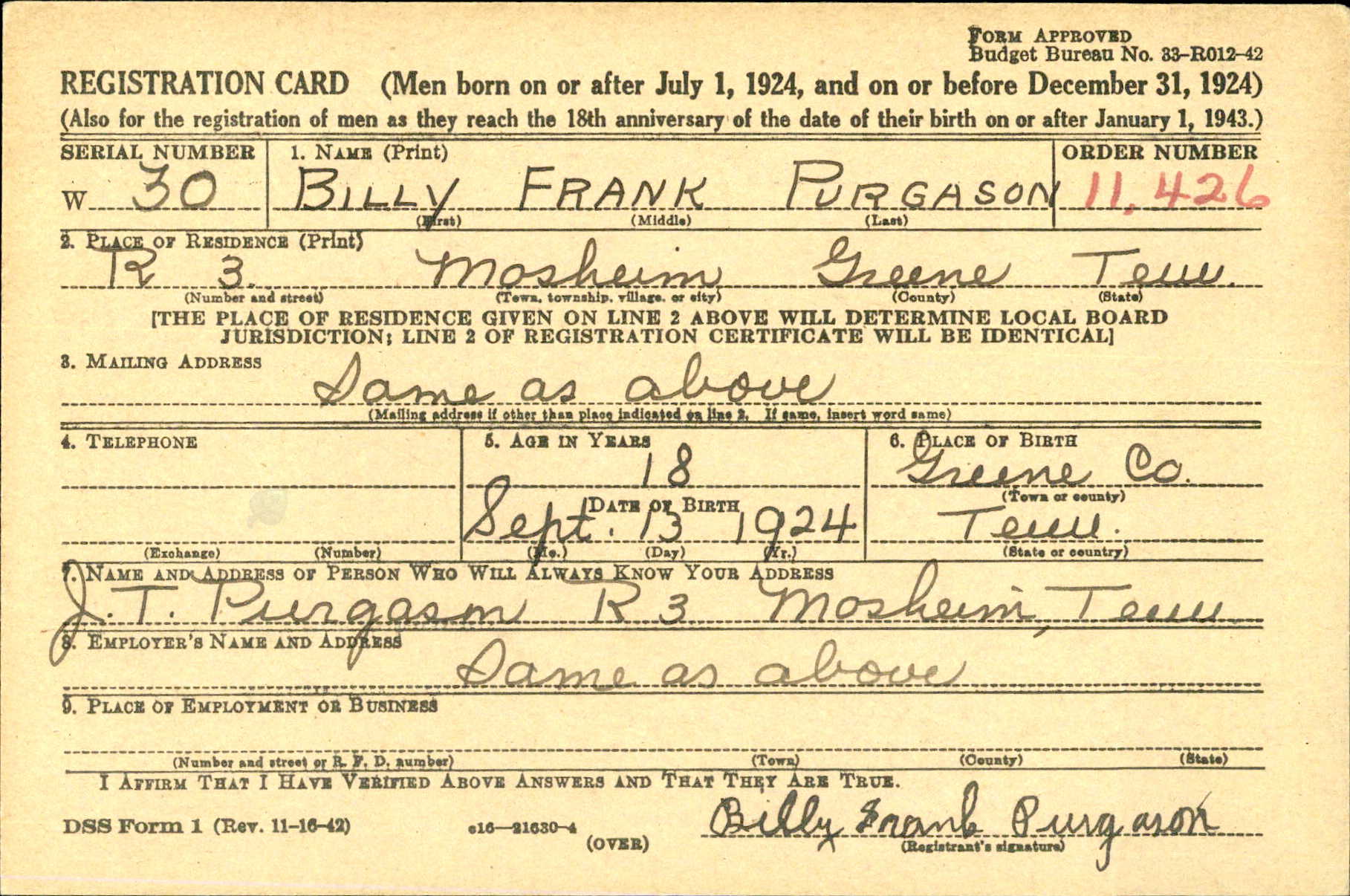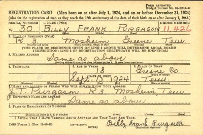 Billy Frank Purgason was born 13 September 1924 to James Thomas Purgason and Pearl Naoma Sauceman