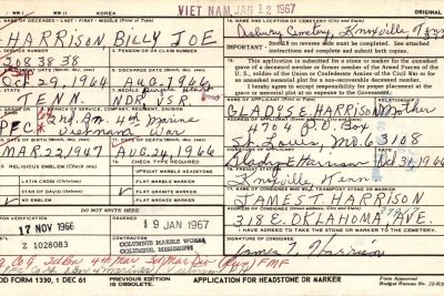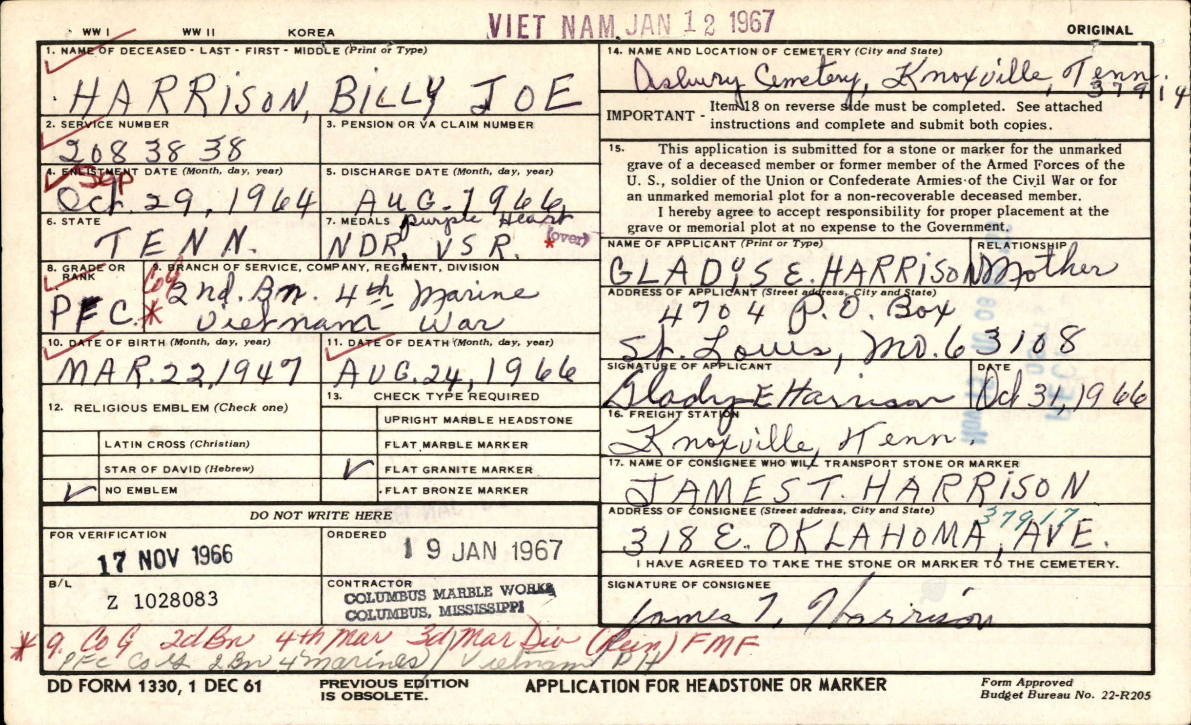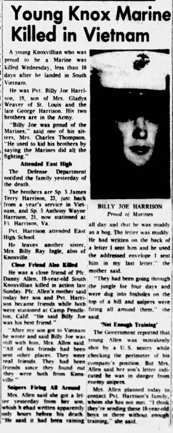 A young Knoxvillian who was proud to be a Marine was killed Wednesday, less than 10 days after he landed in South Vietnam. He was Pvt. Billy Joe Harrison, 19, son of Mrs. Gladys Weaver of St. Louis and the late George Harrison. His two brothers are in the Army. “Billy Joe was proud of the Marines,” said one of his sisters, Mrs. Charles Thompson. “He used to kid his brothers by saying the Marines did all of the fighting.”