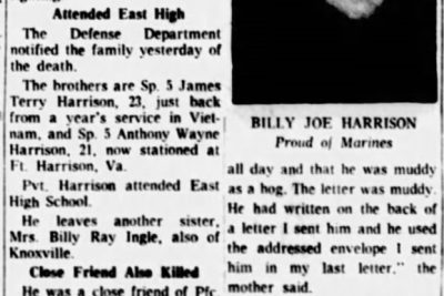 The Defense Department notified the family yesterday of the death. The brothers are Sp.5 James Terry Harrison, 23, just back from a year’s service in Vietnam, and Sp.5 Anthony Wayne Harrison, 21, now stationed at Frt. Harrison, Va. Pvt. Harrison attended East High School. He leaves another sister, Mrs. Billy Ray Ingle, also of Knoxville.