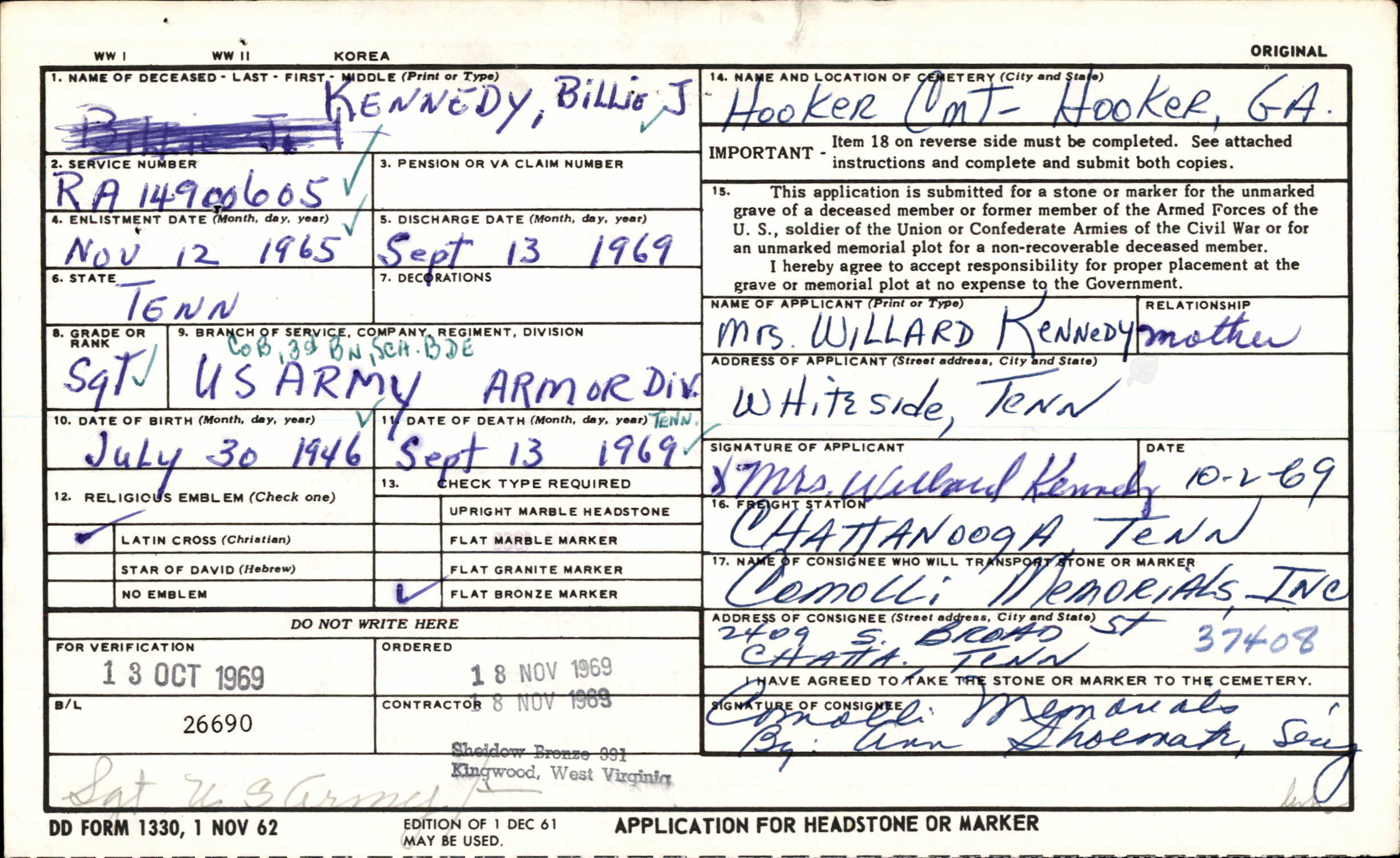 Billy (also spelled as Billie) Jean Kennedy was the son of Willard Kennedy and Jean Davis. He died non battle on 13 September 1969 and is buried at Hooker Cemetery in Georgia