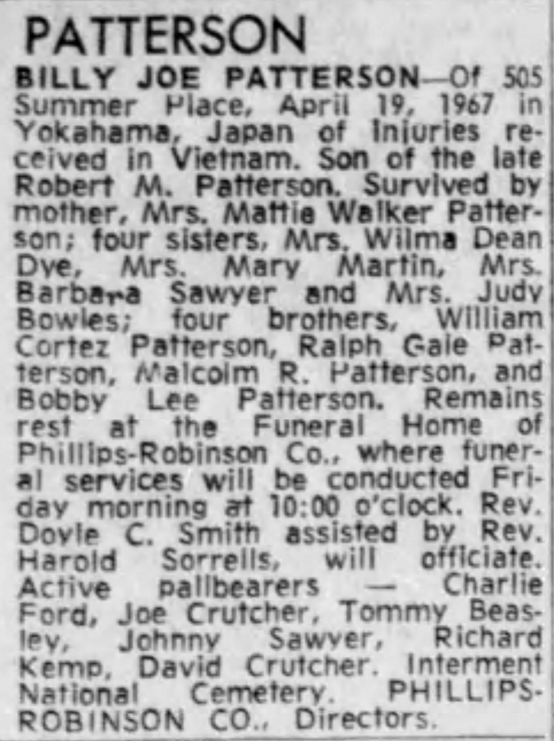Specialist 4th Class Billy Joe Patterson of Nashville was born on December 9, 1945. He was the son of Robert Mitchell Patterson and Mattie Clara Walker Patterson. He had one brother, Ralph Gale Patterson.
